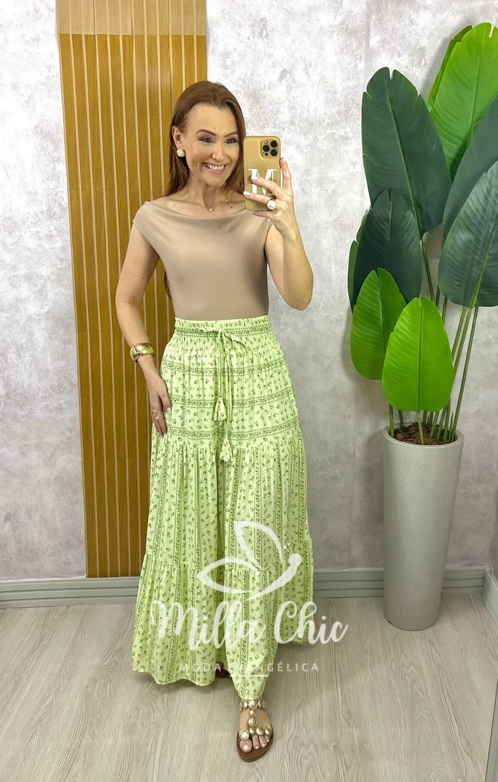 Saia Adélia Em Viscolinho Estampado - Verde Hortelã - Milla Chic