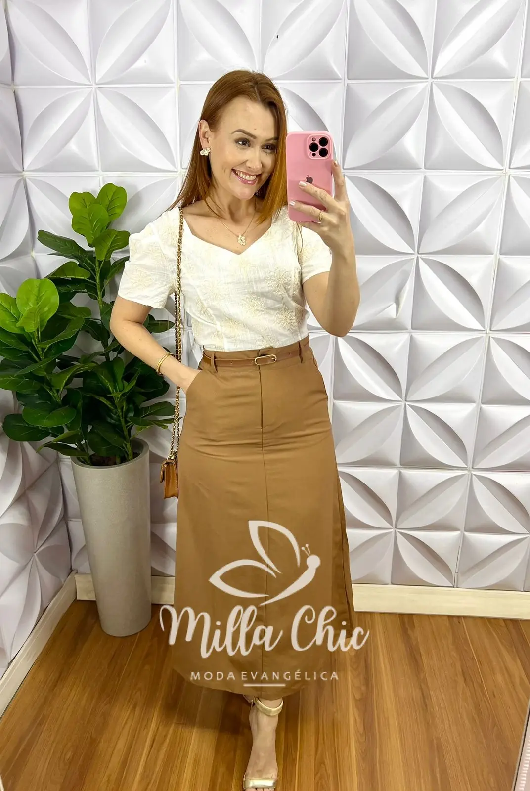 Saia Alfaiataria Marante Evase Cos Alto Quesia – Capuchino