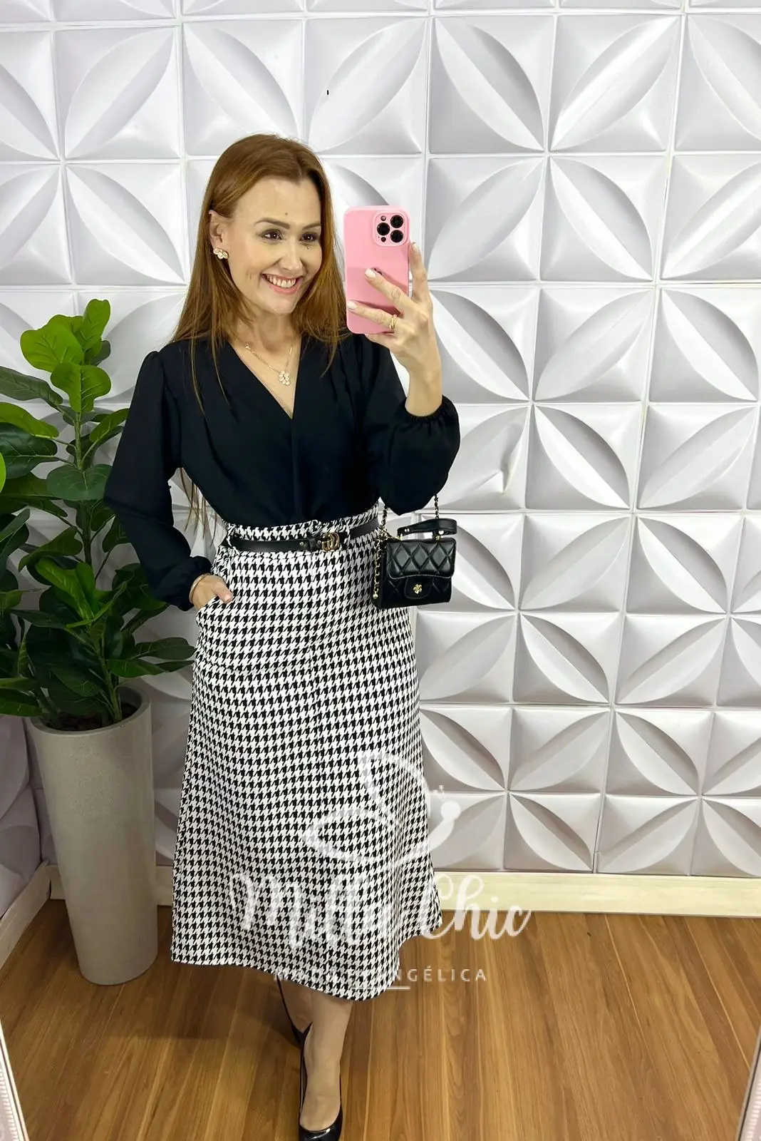 Saia Alfaiataria tecido com o caimento perfeito! Toda na estampa de Pied de Poule que esta um charme!