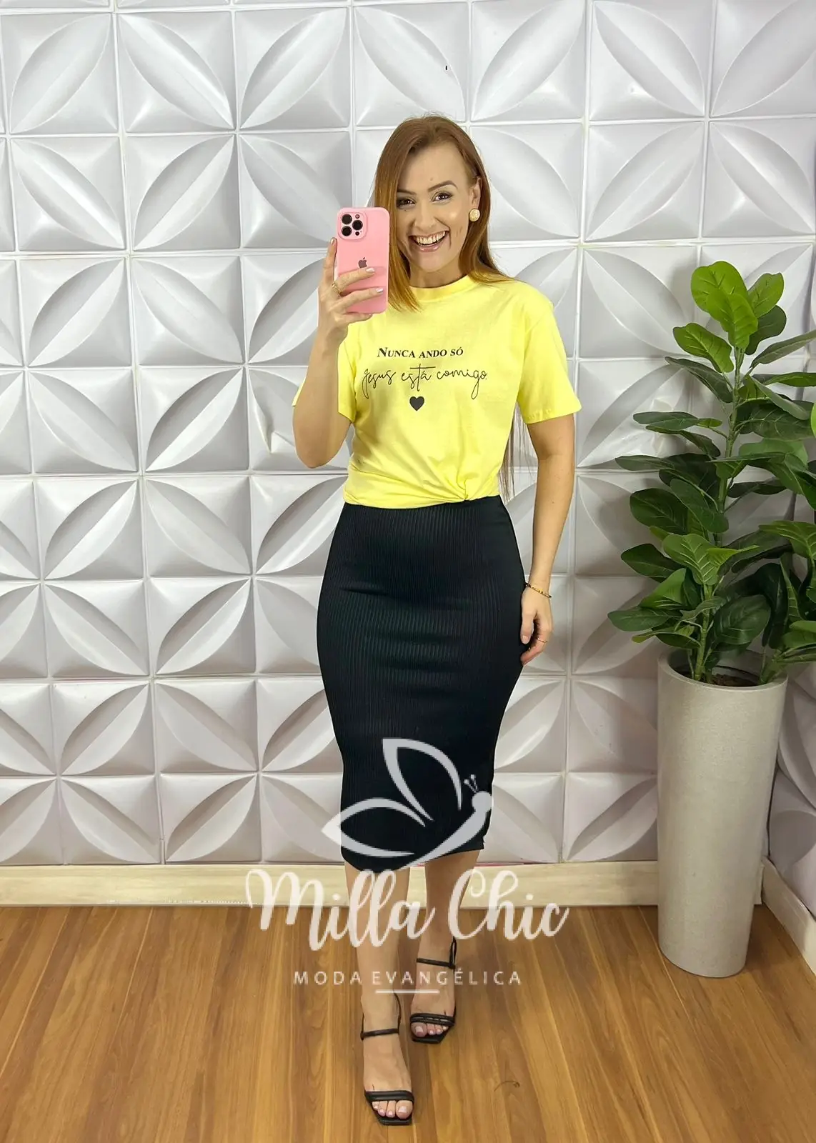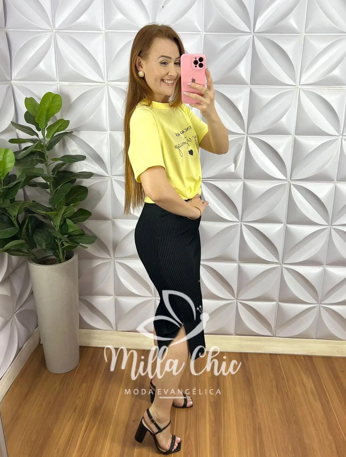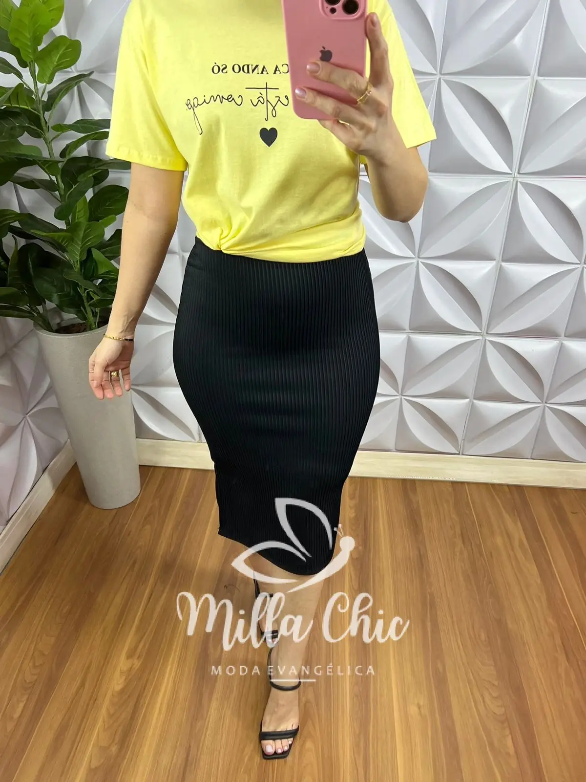Possui: Pala na cintura com elastano, comprimento mídi, caimento tubinho, fenda na lateral. Não possui forro