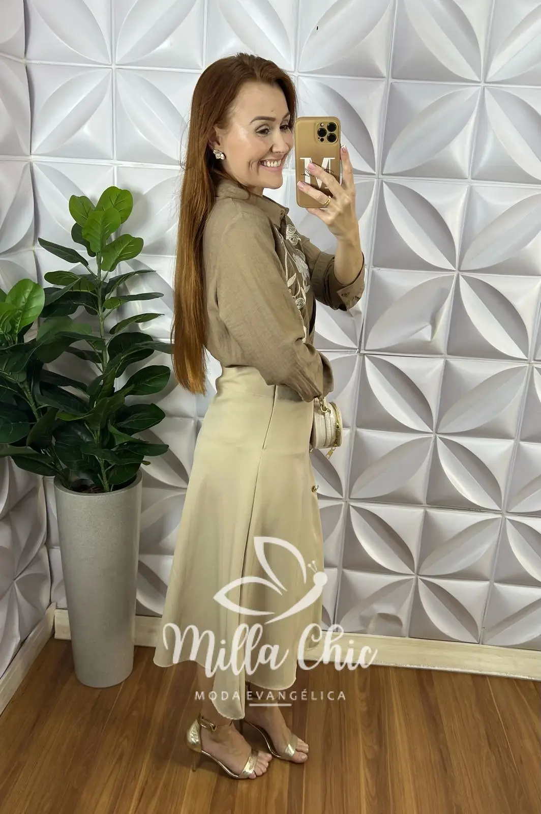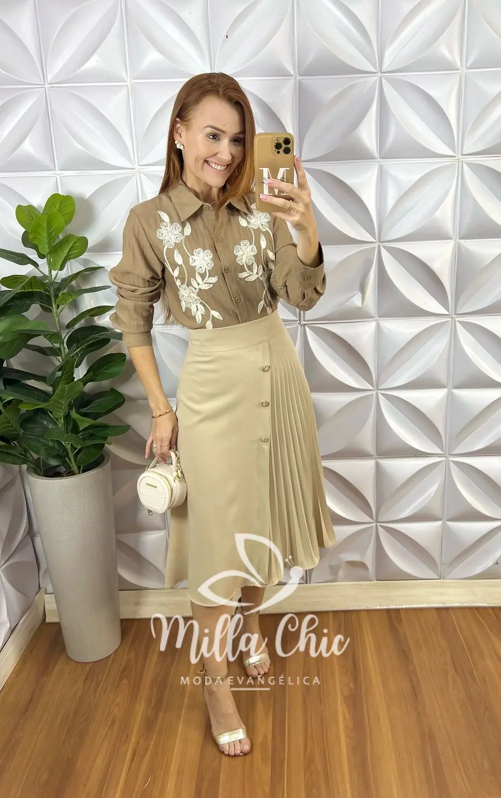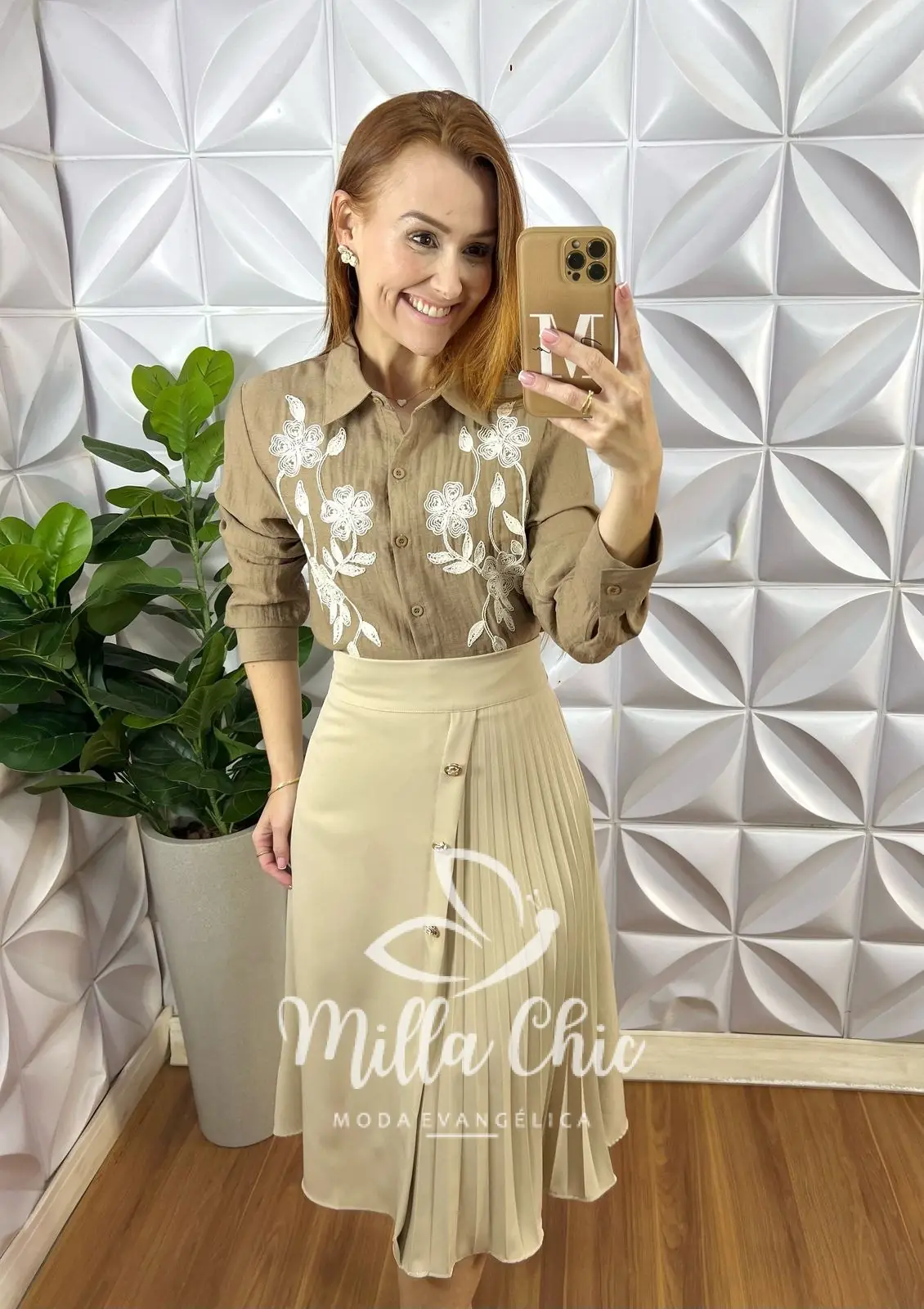 Saia Apolónia Em Alfaiataria Plissada - Nude - Milla Chic