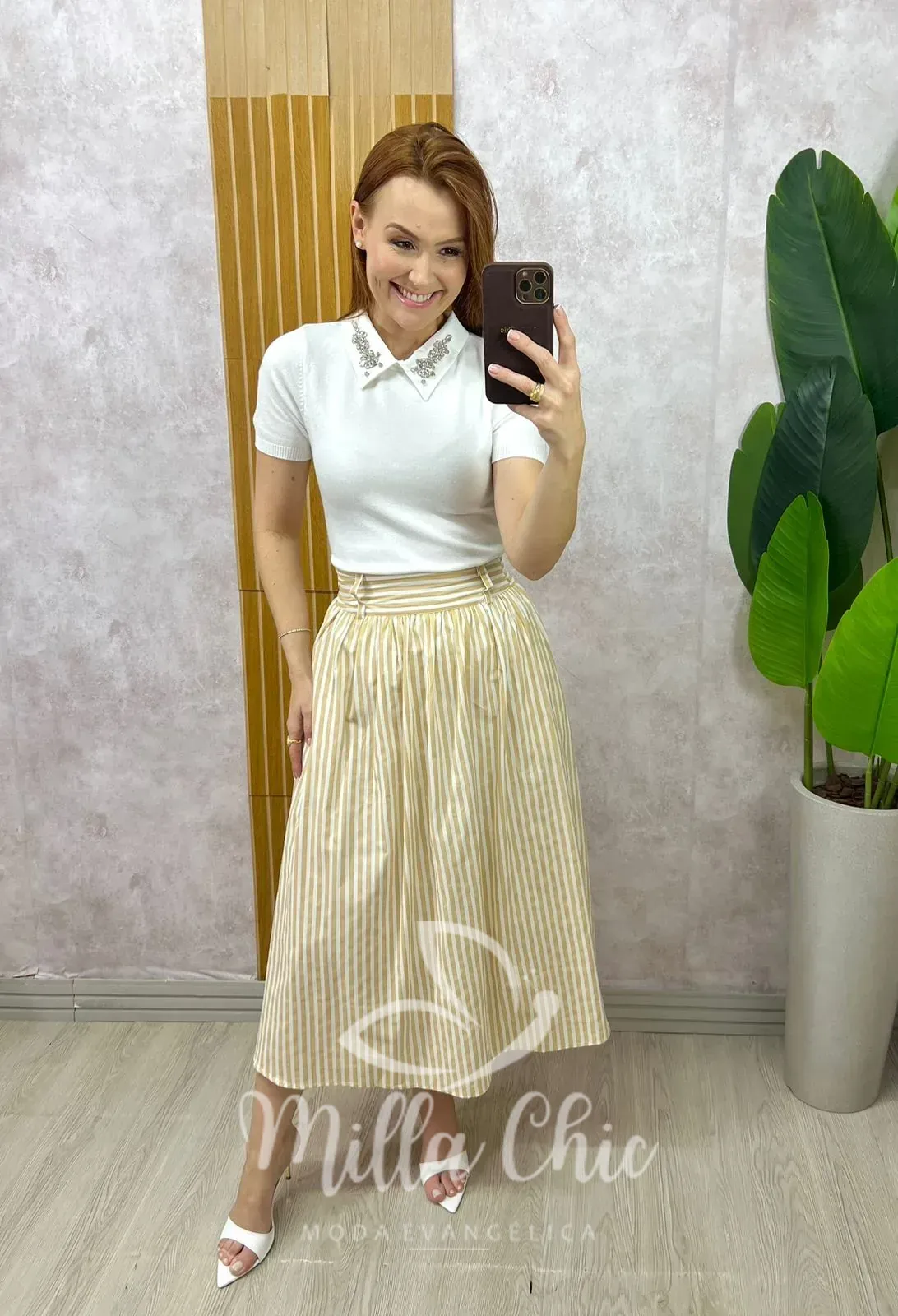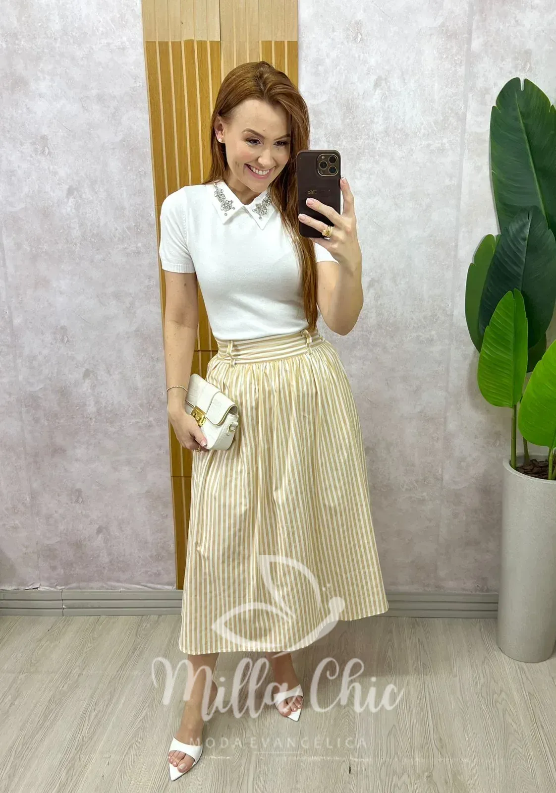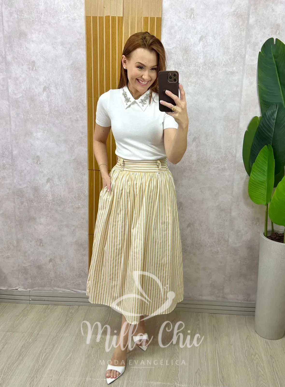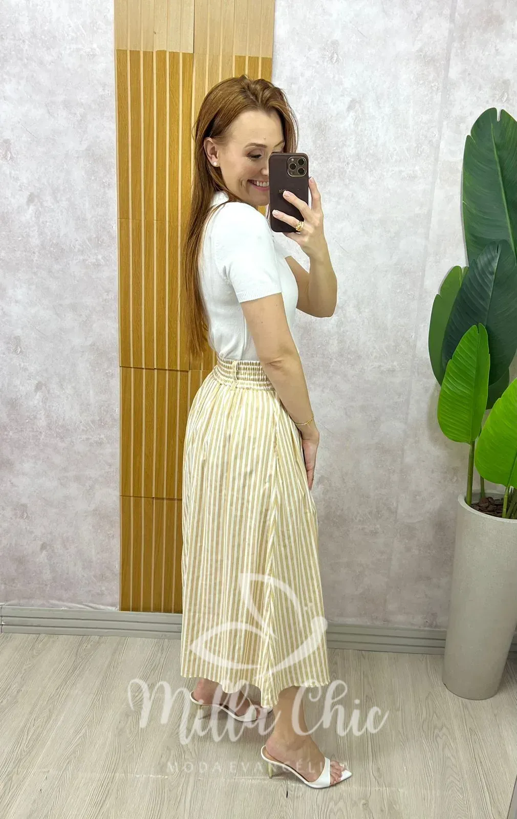 Saia midi em tricoline 100% algodão, leve e sofisticada, com listras delicadas que alongam a silhueta. Possui modelagem fluida e confortável, com cós estruturado na frente e elástico na parte das costas para melhor ajuste ao corpo. Totalmente forrada, garantindo segurança e acabamento impecável. Conta com bolsos laterais funcionais, trazendo praticidade ao dia a dia. Uma peça elegante e versátil, perfeita para composições clássicas e modernas.