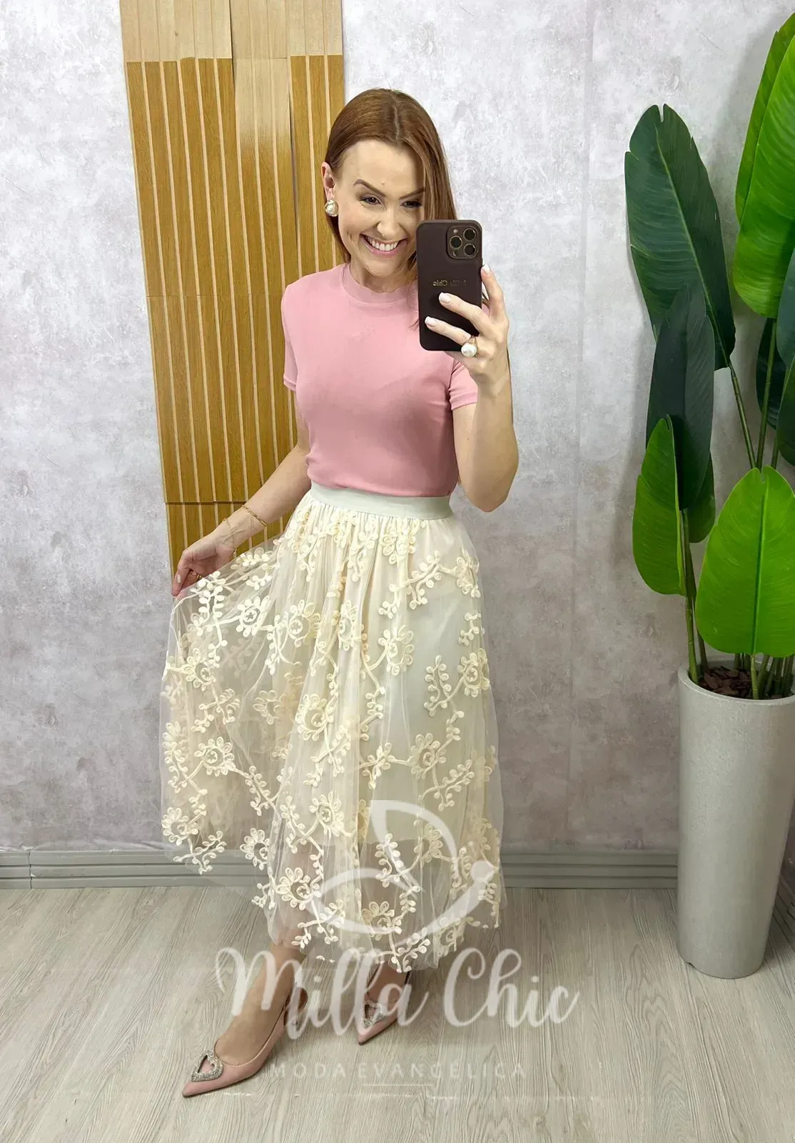 Uma peça que irradia charme e sofisticação, ideal para minha irmãs que desejam expressar sua personalidade através da moda. Com um design encantador ela é confeccionado em tule com um bordado maravilhoso e sofisticado . Um saia que passa elegância , tem um caimento maravilhoso além de muito confortável . Está saia é perfeita para diversas ocasiões, para o culto , casamentos , ela deixa o look mais lindo e sofisticado .