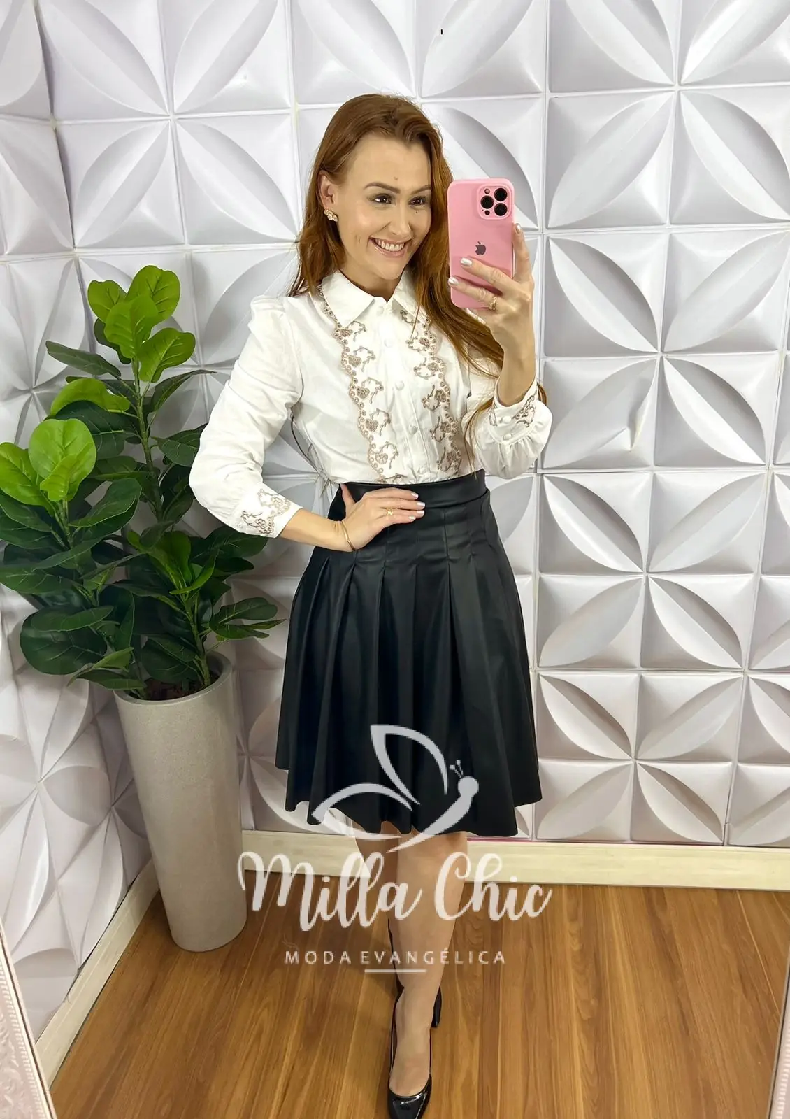 Saia Couro Toda De Pregas Ate o Joelho Havana - Preta - Milla Chic