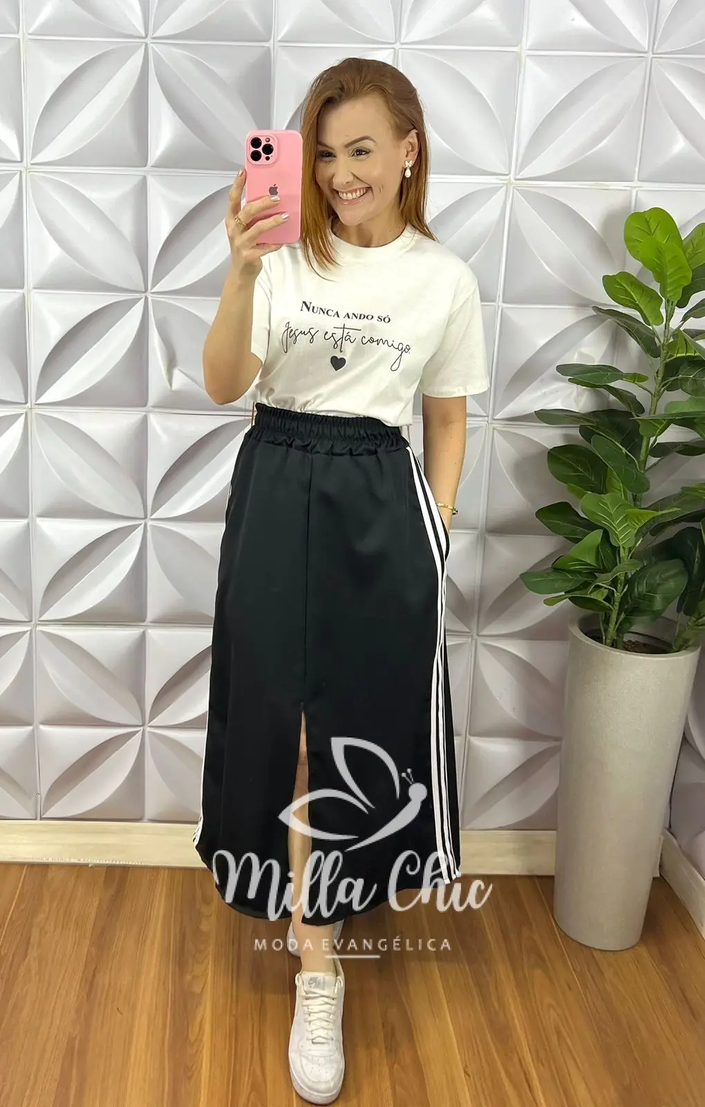 Possui: Pala de Lastex na cintura, com detalhe de listra de aviamento na lateral, bolso lateral, comprimento longo, caimento evase com fenda frontal.