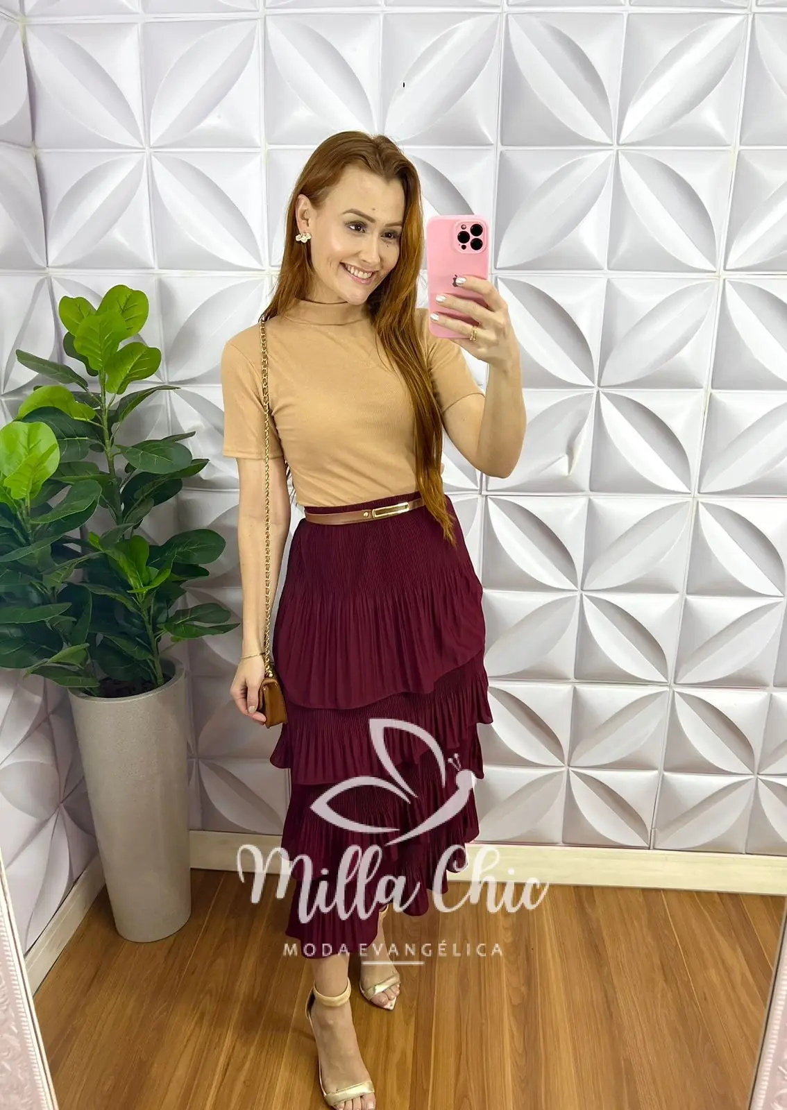 Saia Crepe Alfaiataria Plissada De Camadas Anylara - Cherry - Milla Chic
