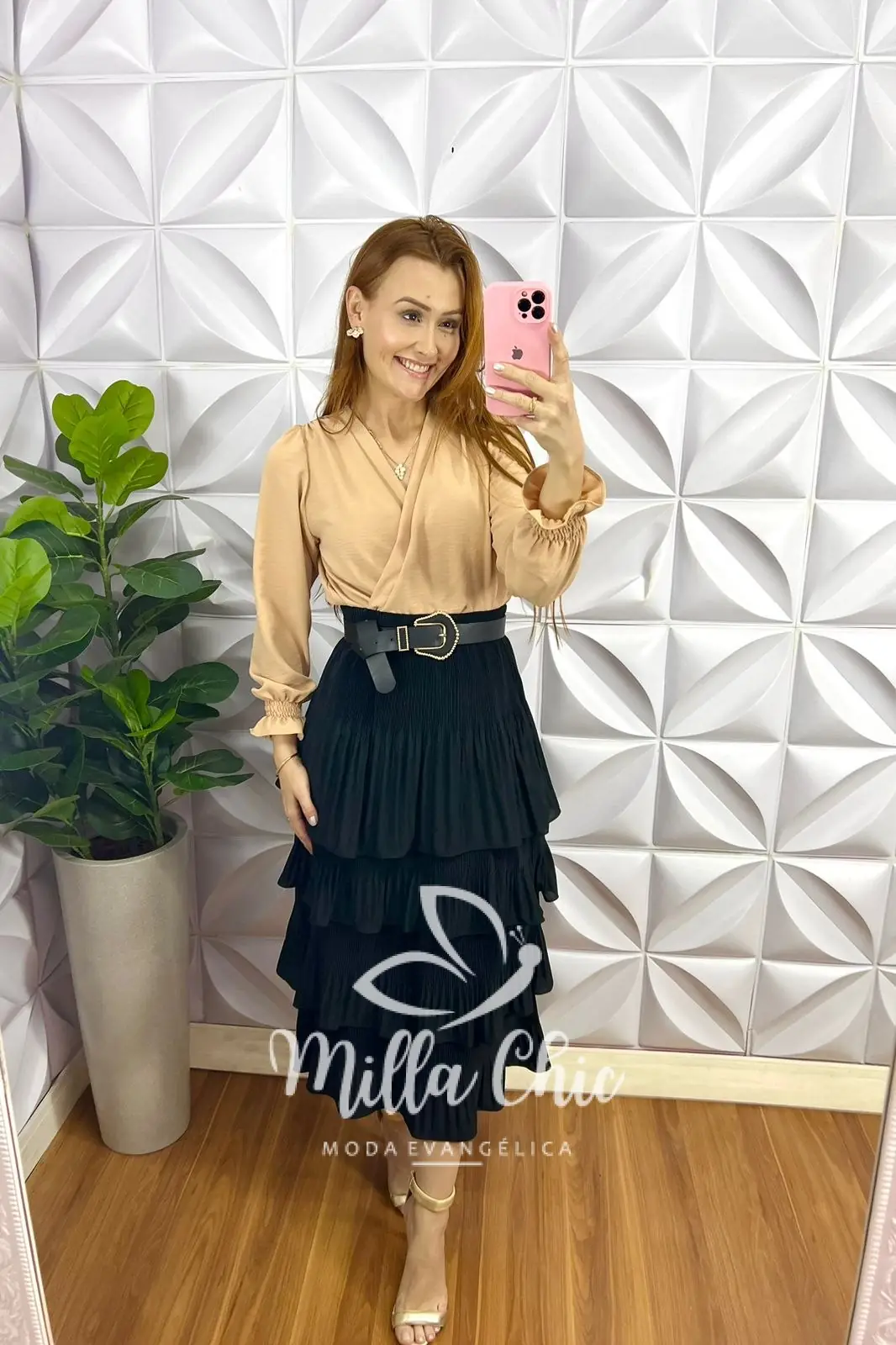 Saia Crepe Alfaiataria Plissada De Camadas Anylara – Preta