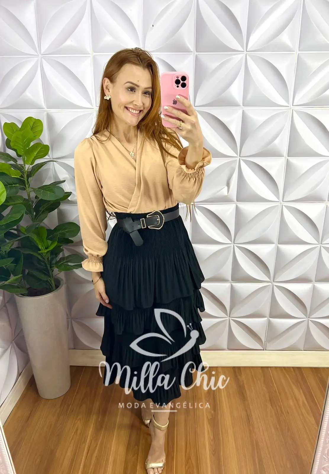 Que saia que está de arrasar irmãzonas! Toda no tecido Crepe Alfaiataria com o caimento perfeito! Toda Forrada, pala na cintura de elástico para vestir bem! Caimento evase, Comprimento Mídi com camadas de babados e entremeios plissado que esta um charme!