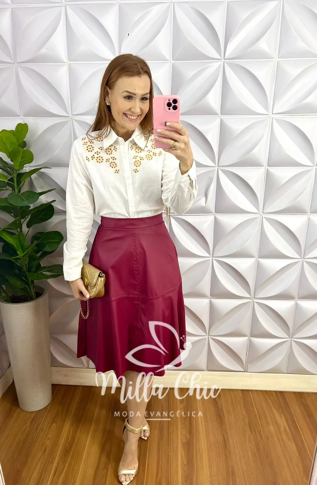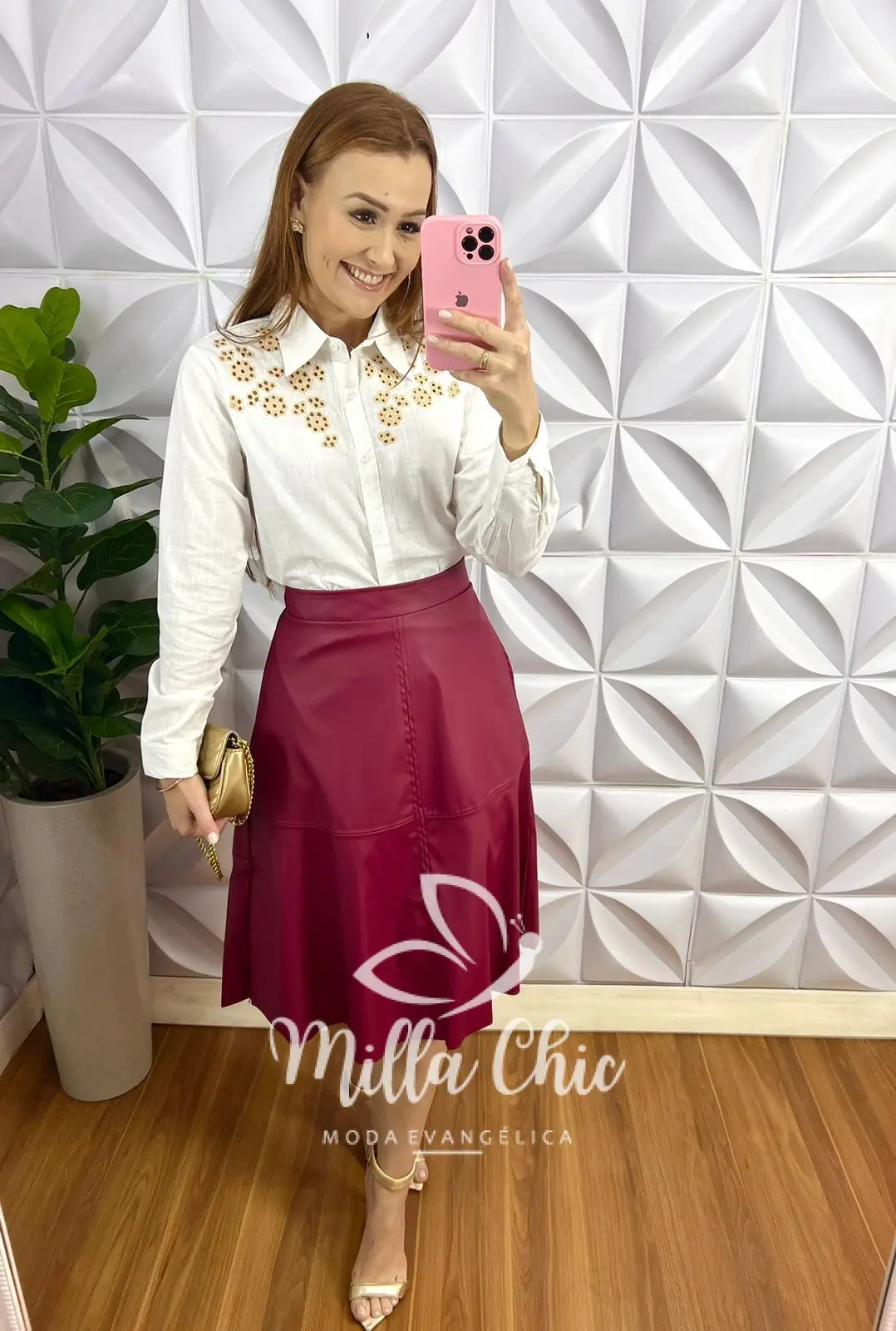 Camisa Linho Bordado Richilieu Manga Longa Brenda - Branca - Milla Chic