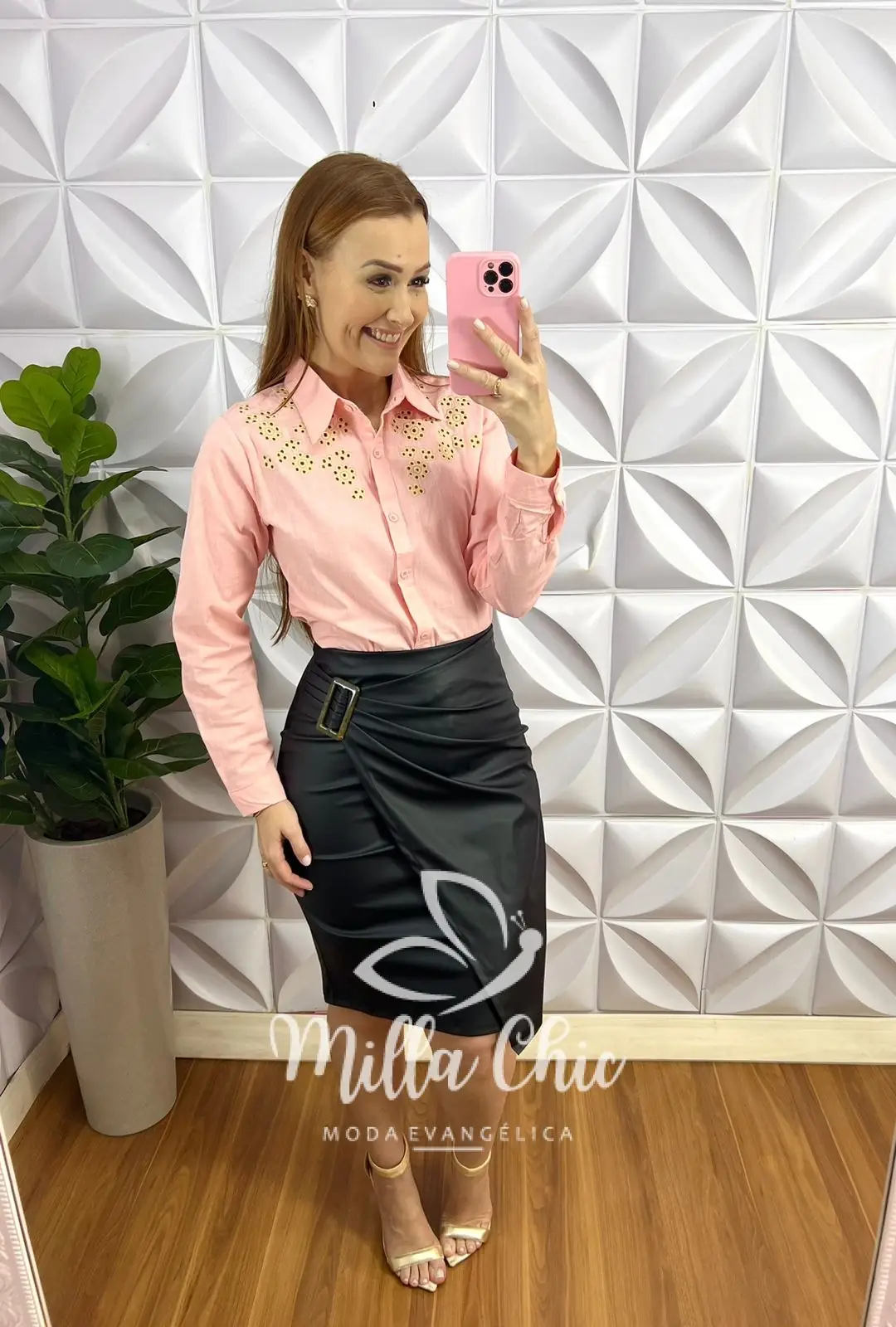 Saia De Couro Modelo Reta Com Faixa Envelope Lateral Fatima - Preta - Milla Chic