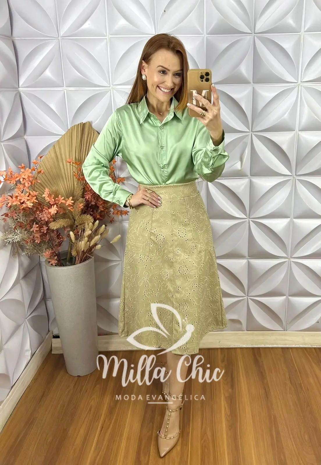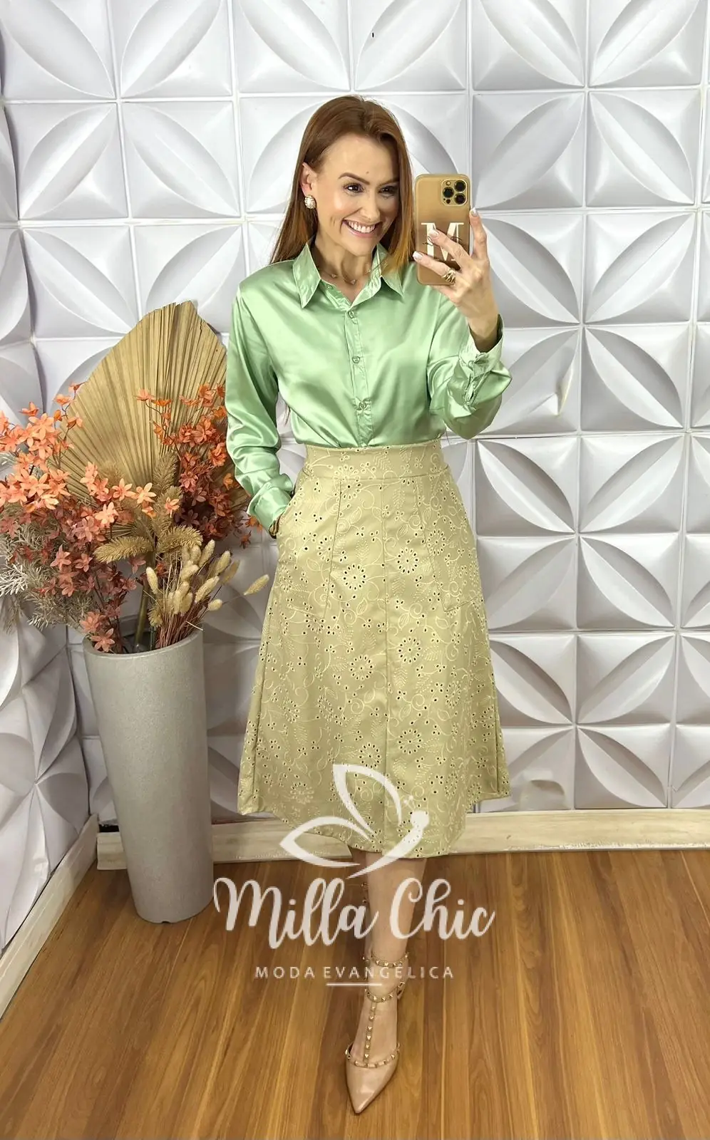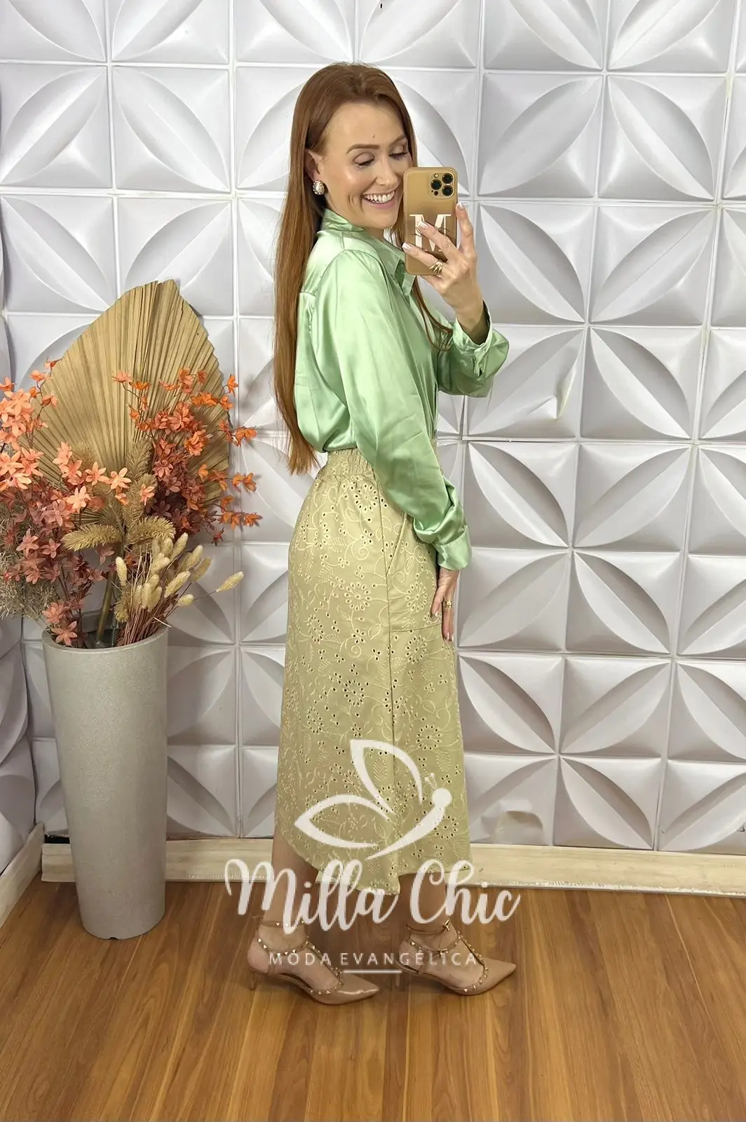 A saia Deisy se destaca pelos detalhes encantadores, como o tecido todo bordado que passa muita delicadeza e elegância . A modelagem que valoriza a silhueta de forma feminina com um leve toque evasê . O cós na parte das costas possui elástico que deixa o encaixe perfeito .