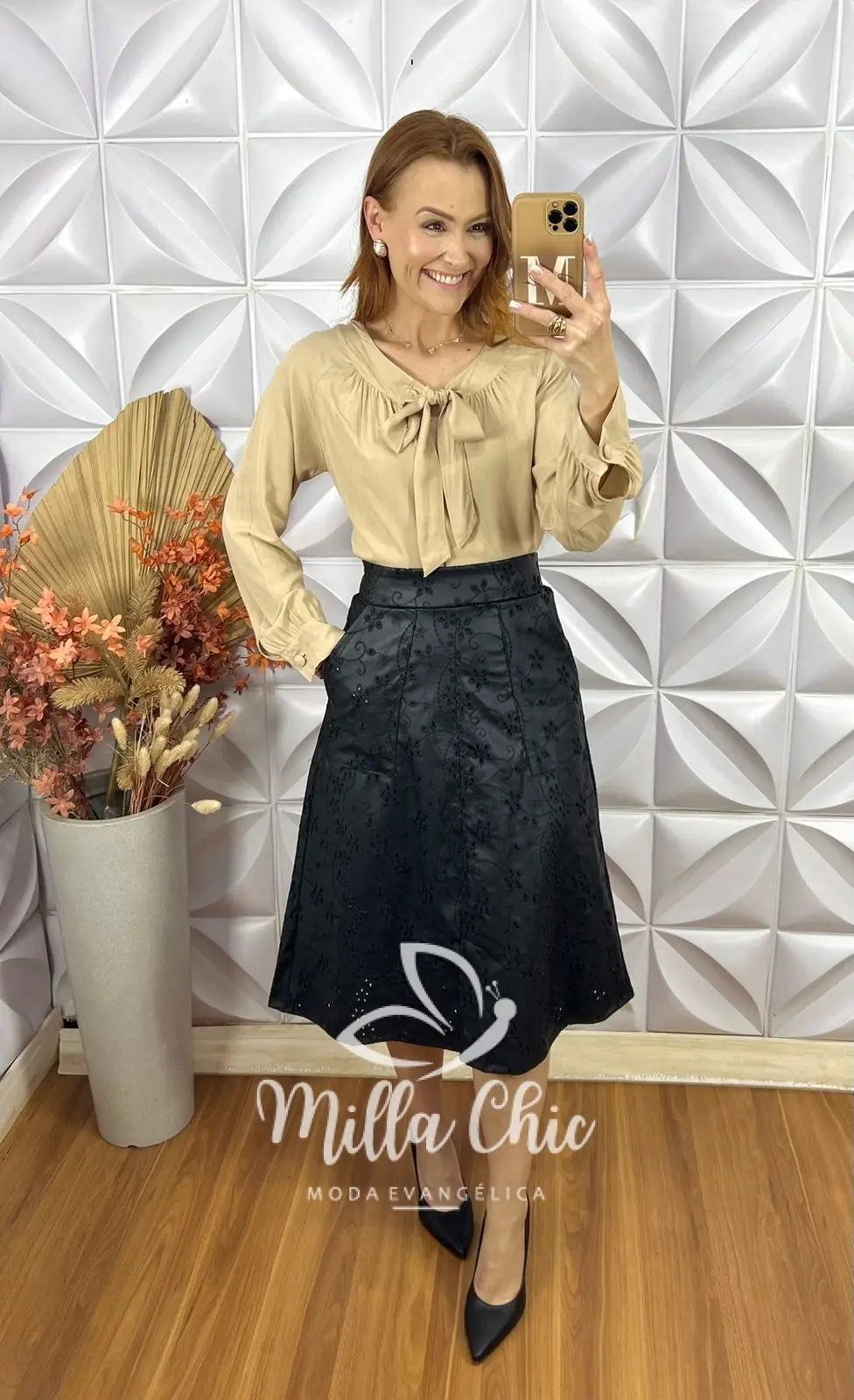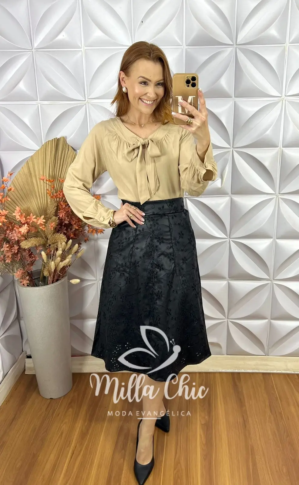A saia Deisy se destaca pelos detalhes encantadores, como o tecido todo bordado que passa muita delicadeza e elegância . A modelagem que valoriza a silhueta de forma feminina com um leve toque evasê . O cós na parte das costas possui elástico que deixa o encaixe perfeito .