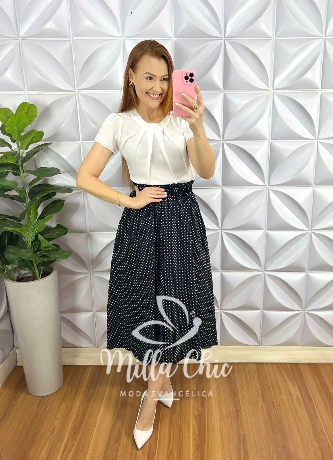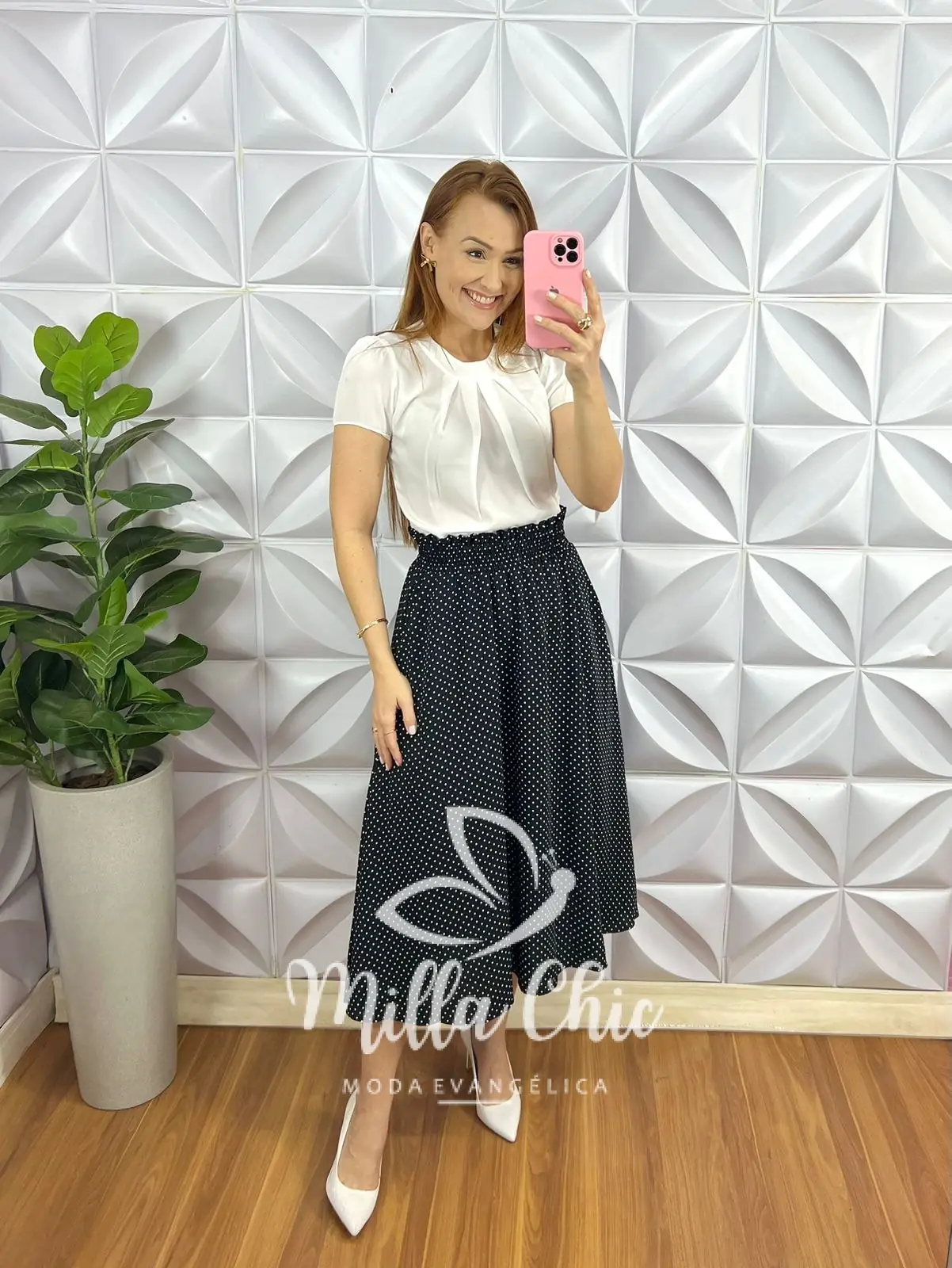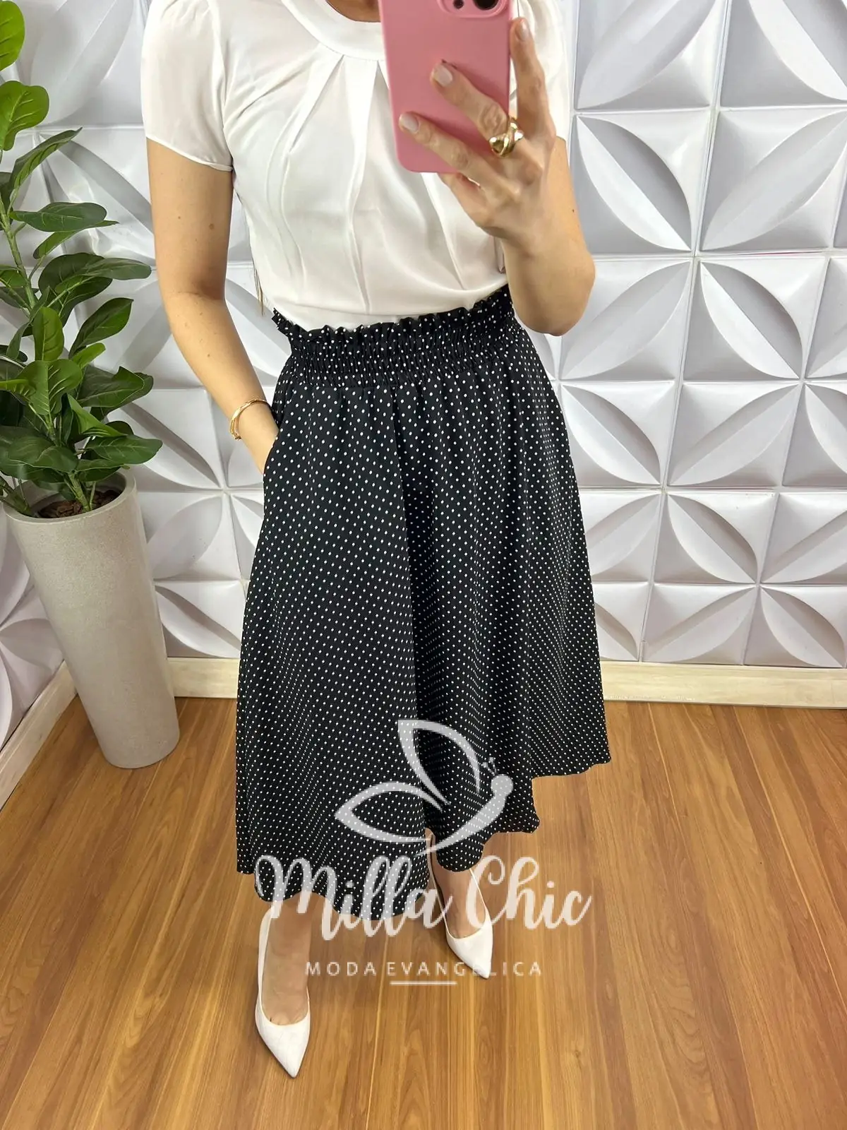 Saia no tecido Dunna bem fresquinha! Para usar em qualquer ocasião e ficar confortável com estampa poá que esta um charme!