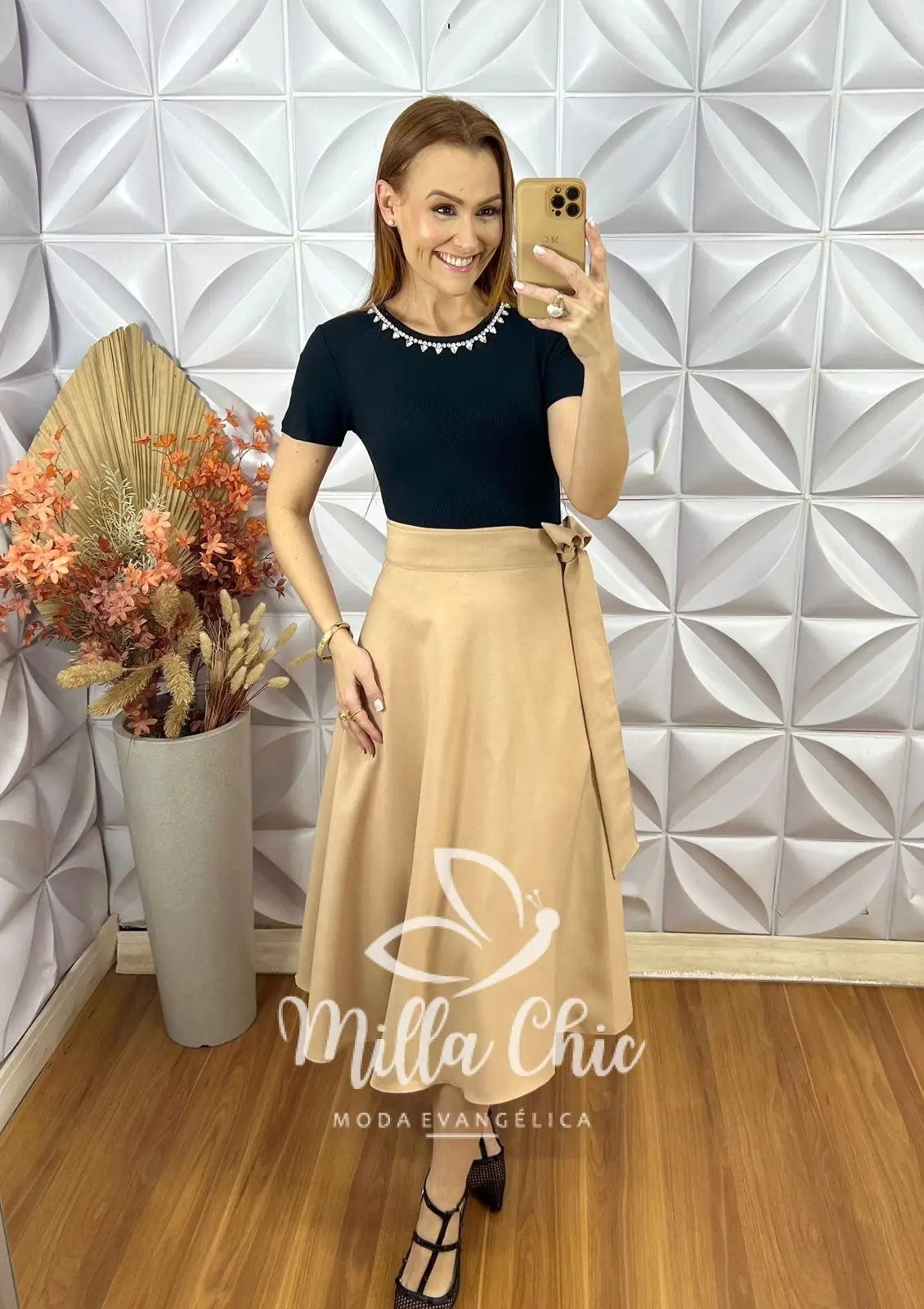 Em tamanho único (veste do 36 ao 44), ela possui amarração lateral regulável, permitindo adaptação ao corpo com conforto e segurança. A modelagem transpassada ajusta-se à cintura e contorna o quadril com equilíbrio, proporcionando um visual refinado que acompanha o movimento do corpo com naturalidade.