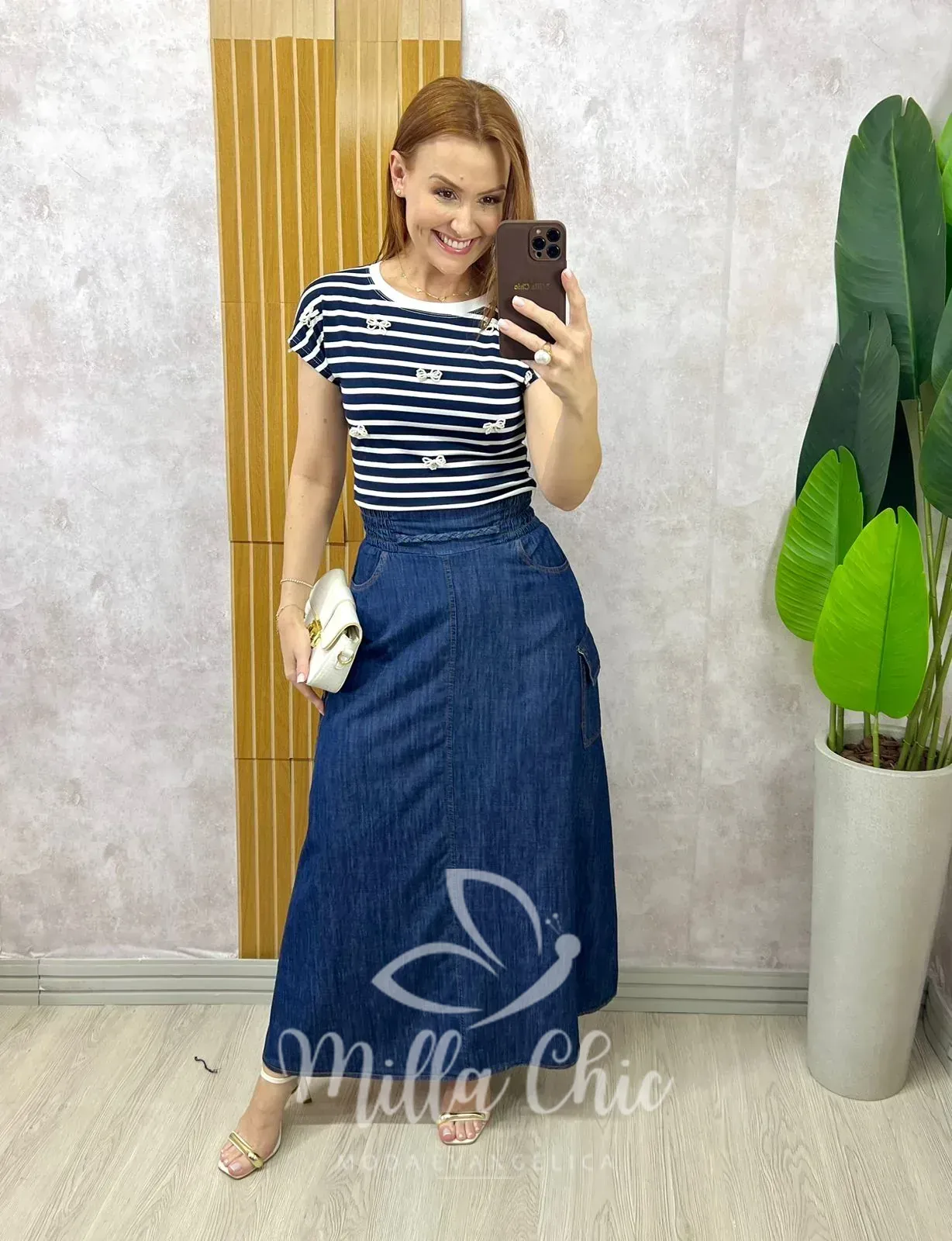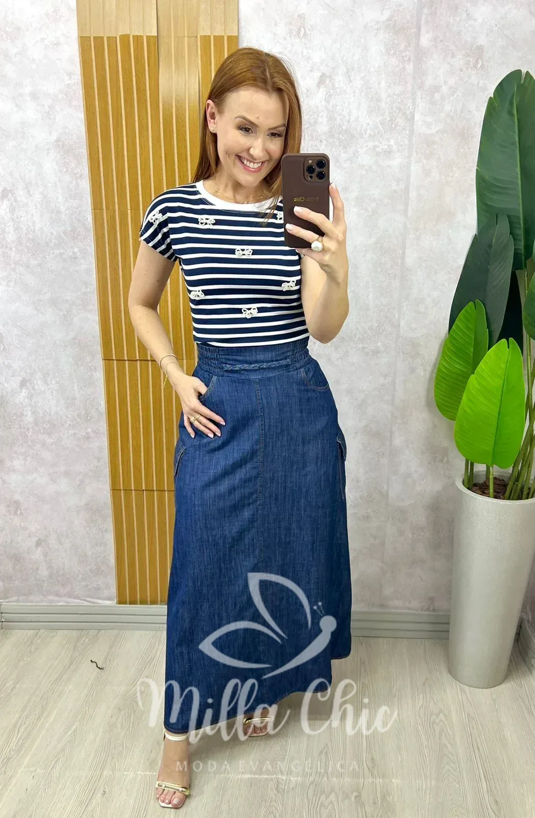 A saia jeans Hortencia é perfeita para deixar seu visual ainda mais charmoso! Ideal para todos os momentos: um jeans casual e chic . Super moderna . Seu corte e modelagem, vão fazer você se sentir linda e extremamente confortável! Os bolsos laterais cria a ideia de uma peça moderna e descolada. Crie composições lindíssimas com blusas e camisas, para tornar ainda perfeito! Componha com saltos, para uma produção elegante ou com tênis e rastreiras para a produção mais casual. A Saia longa Hortencia é toda confeccionada no Jeans de Algodão {tecido bem confortável possui}: cós alto com passante com detalhe trançado , não possui ziper . Na cintura na parte das costas ela conta com o elástico que além de vestir vem sem deixar largo na cintura , traz muito conforto . Bolso lateral funcional e saia evasê dando fluídez sem armar .