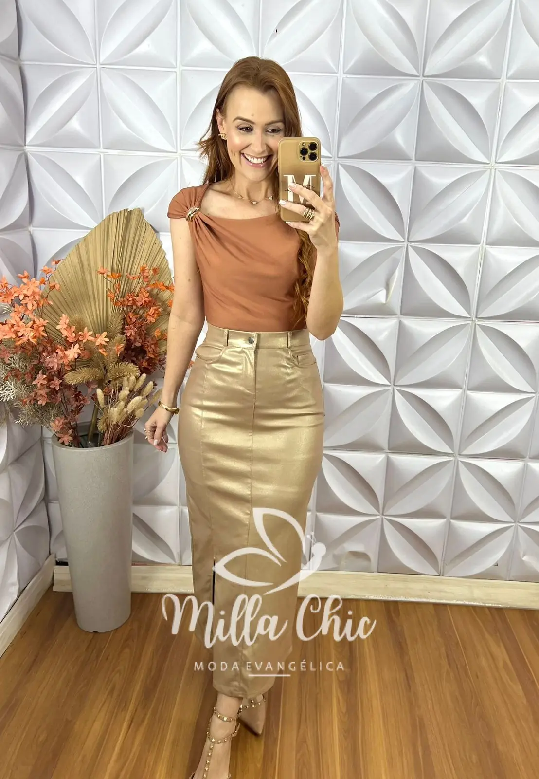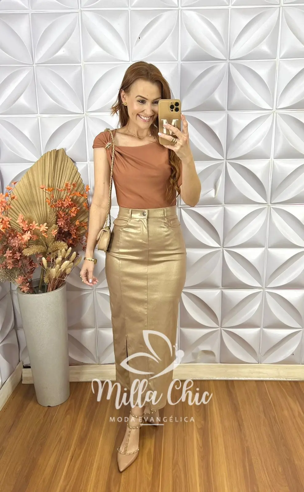 Saia Iris Em Sarja Resinada- Dourado - Milla Chic
