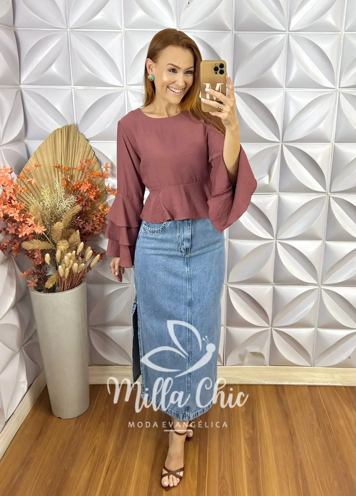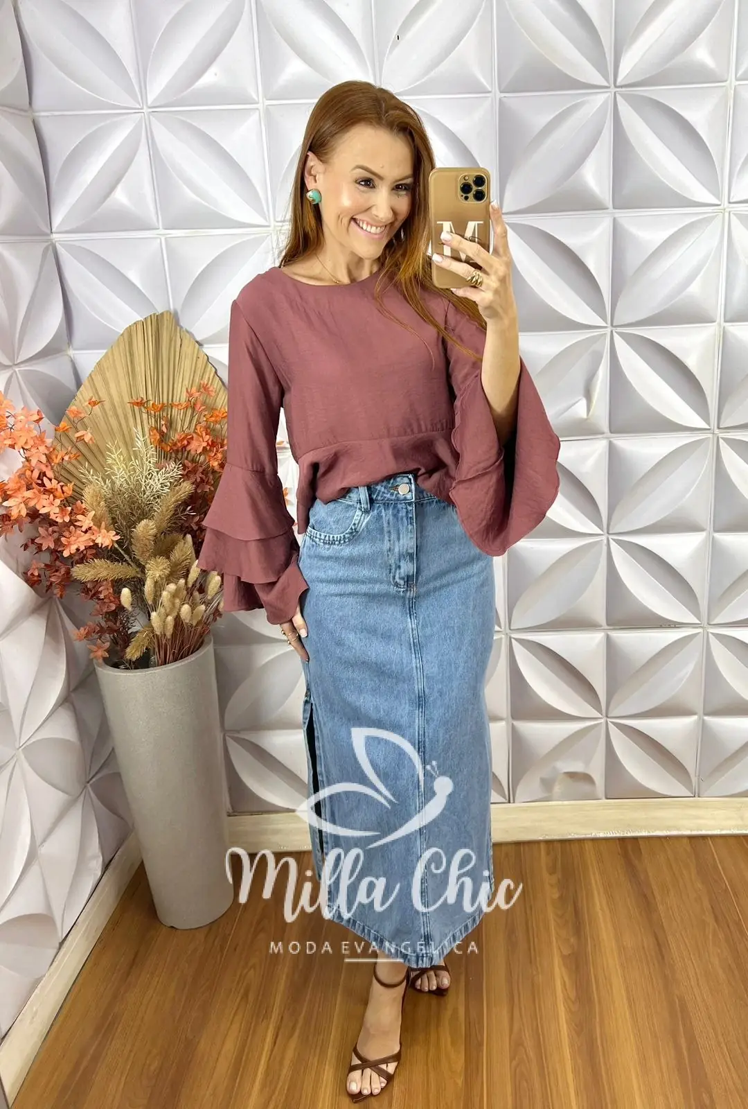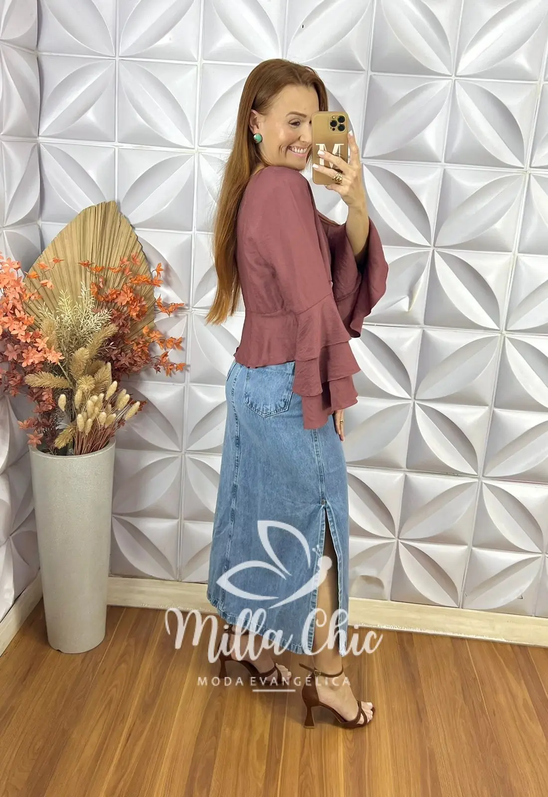Nossa saia jeans Bárbara é um modelo chic e moderno . Possui fendas laterais que dão todo um toque de estilo para ela .