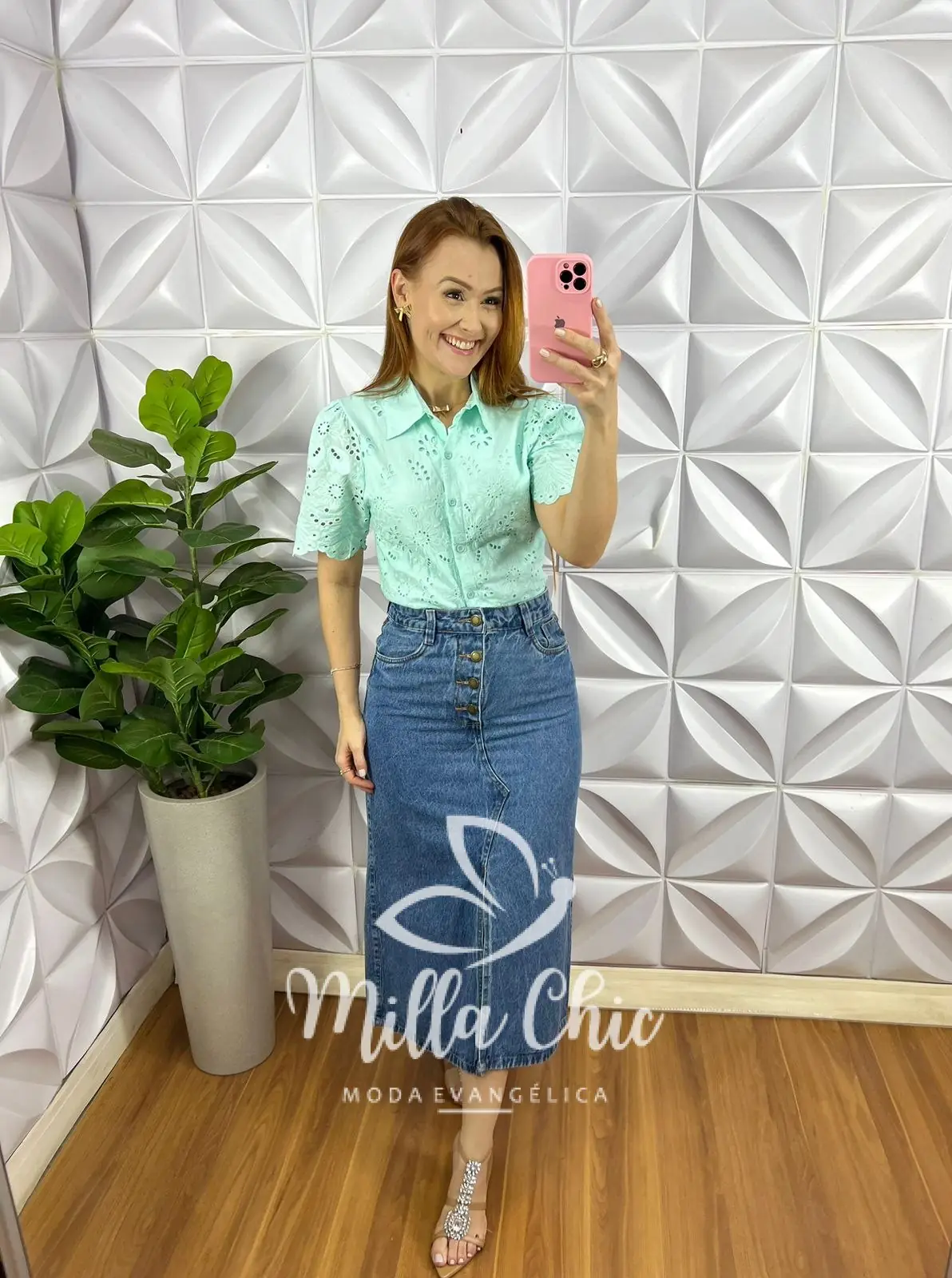 Saia Jeans Com Botões e Fendas Frontal Mídi Liliane – Jeans