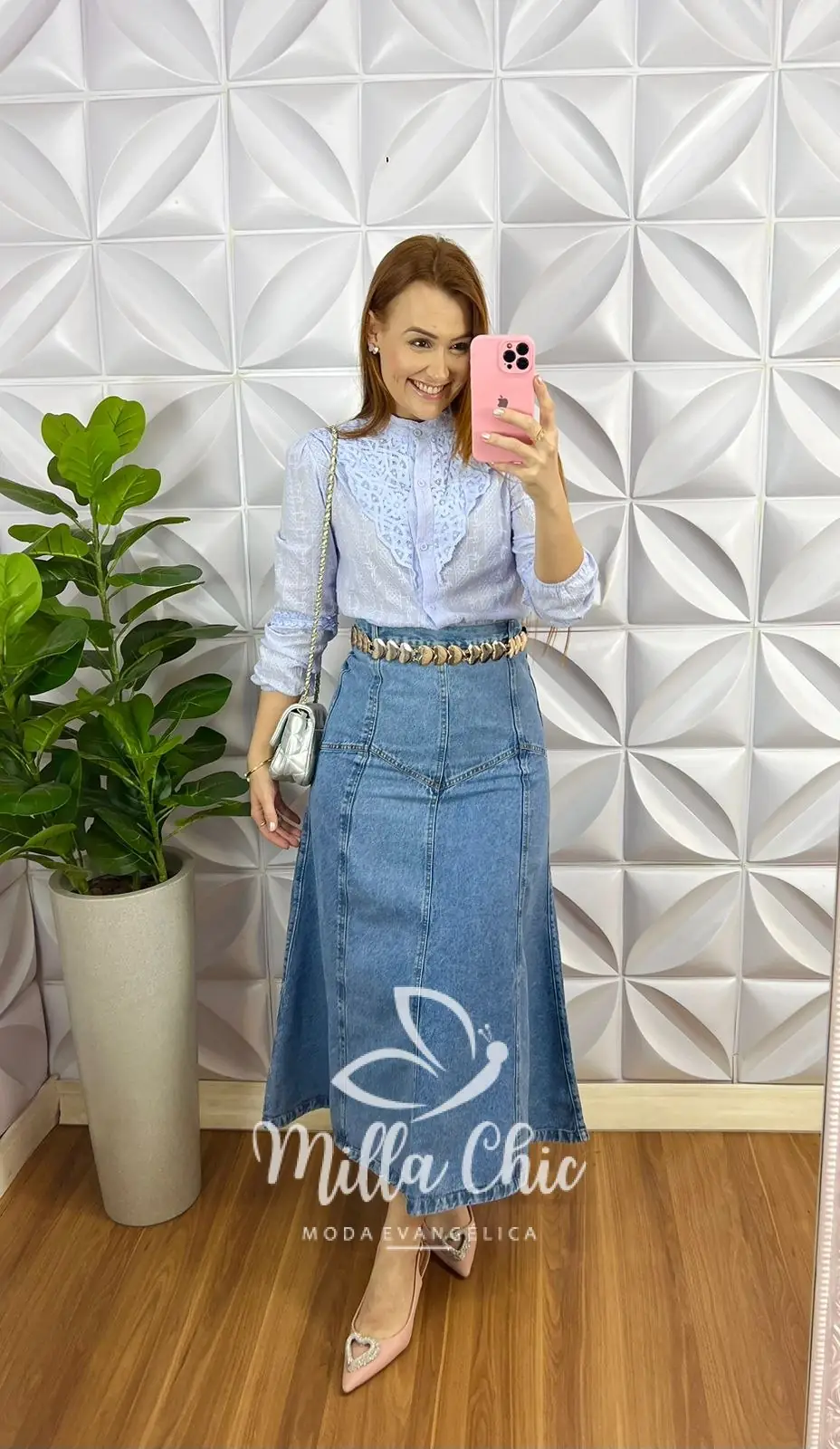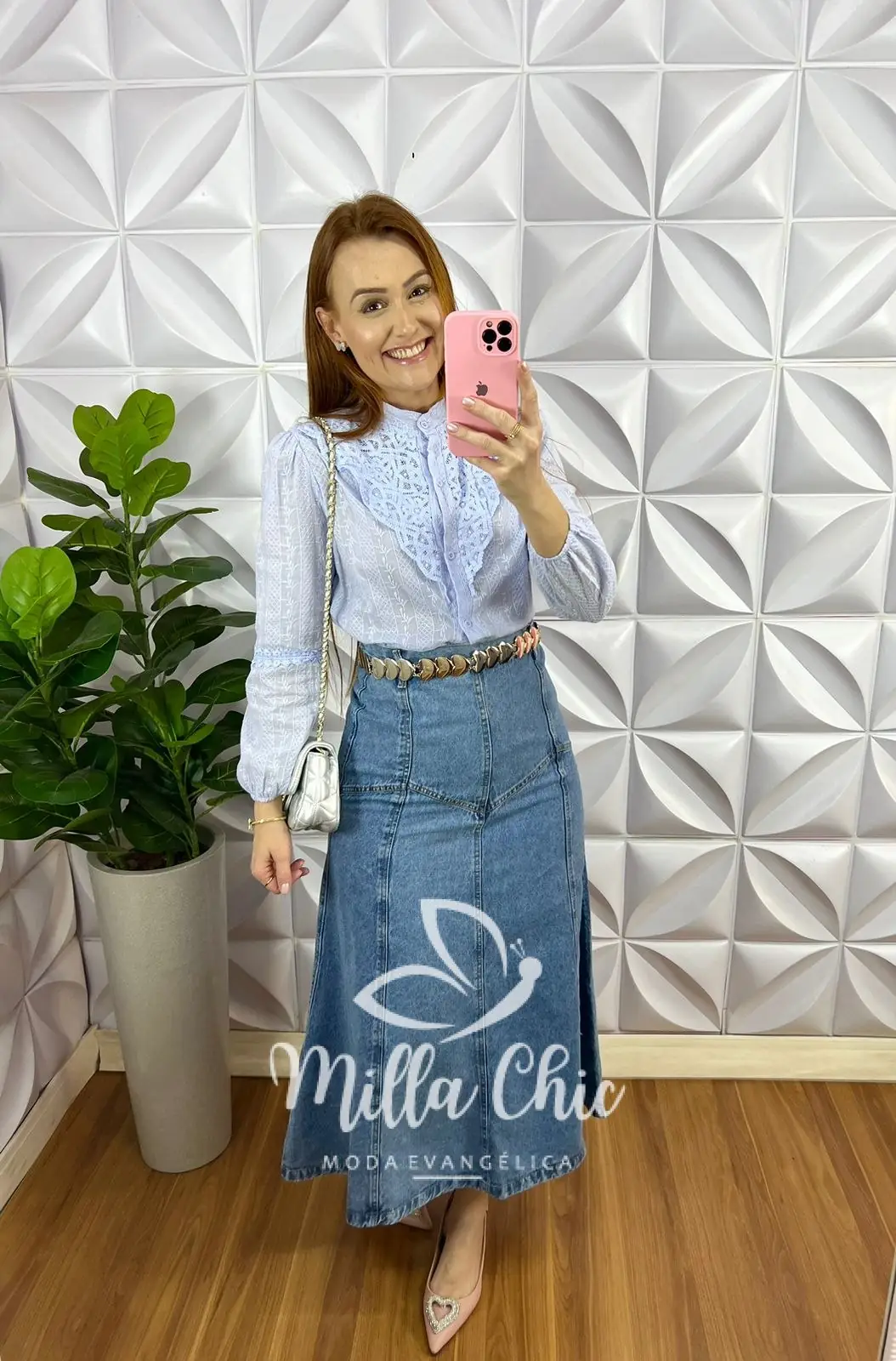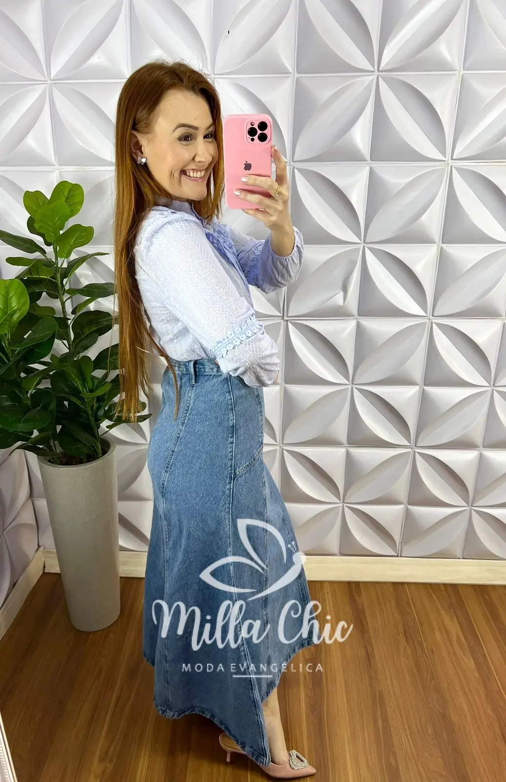 Saia Jeans Evase Com Recortes Mídi Aline - Azul - Milla Chic