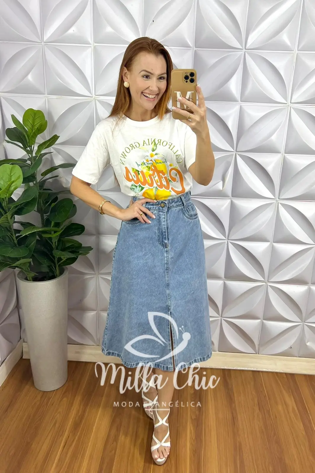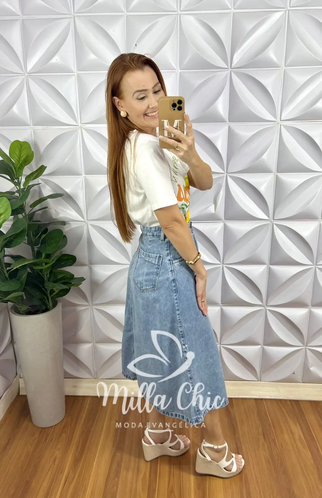 Nossa saia jeans Iara é um modelo maravilhoso que veste super bem e deixa minhas irmãs estilosas e modernas .