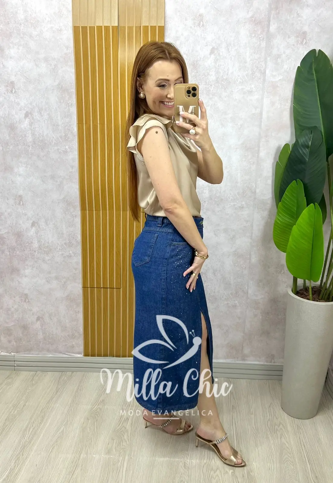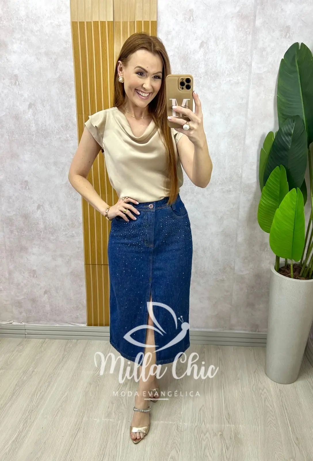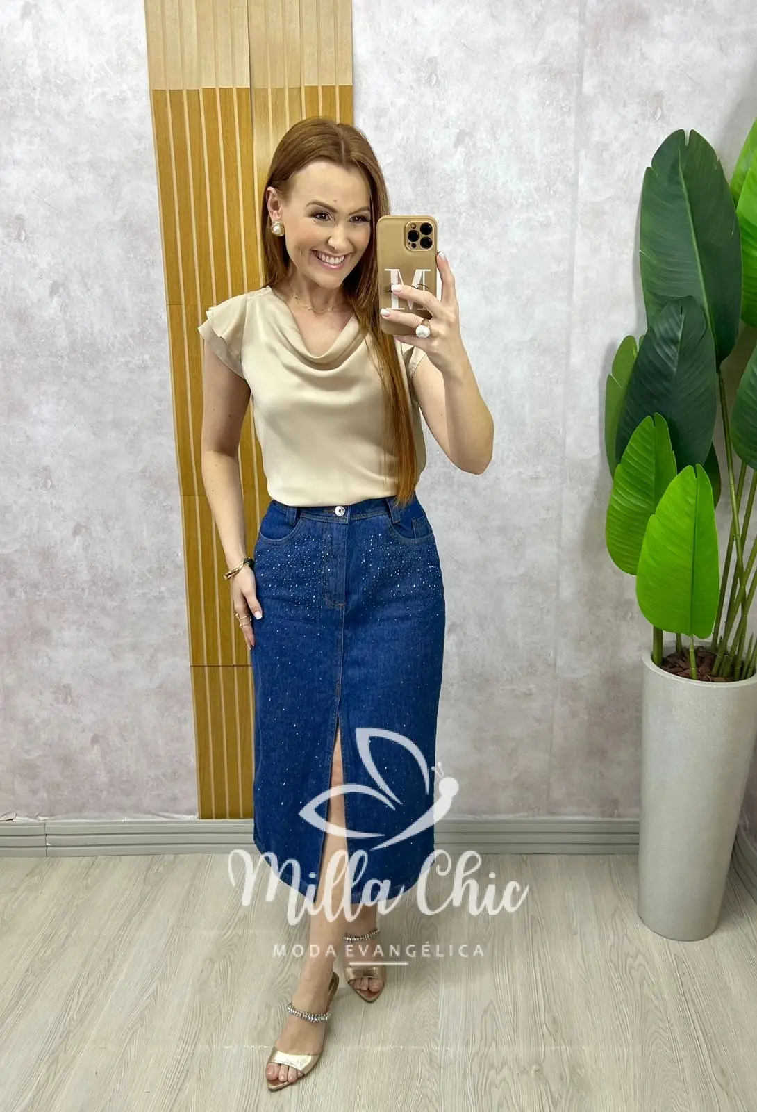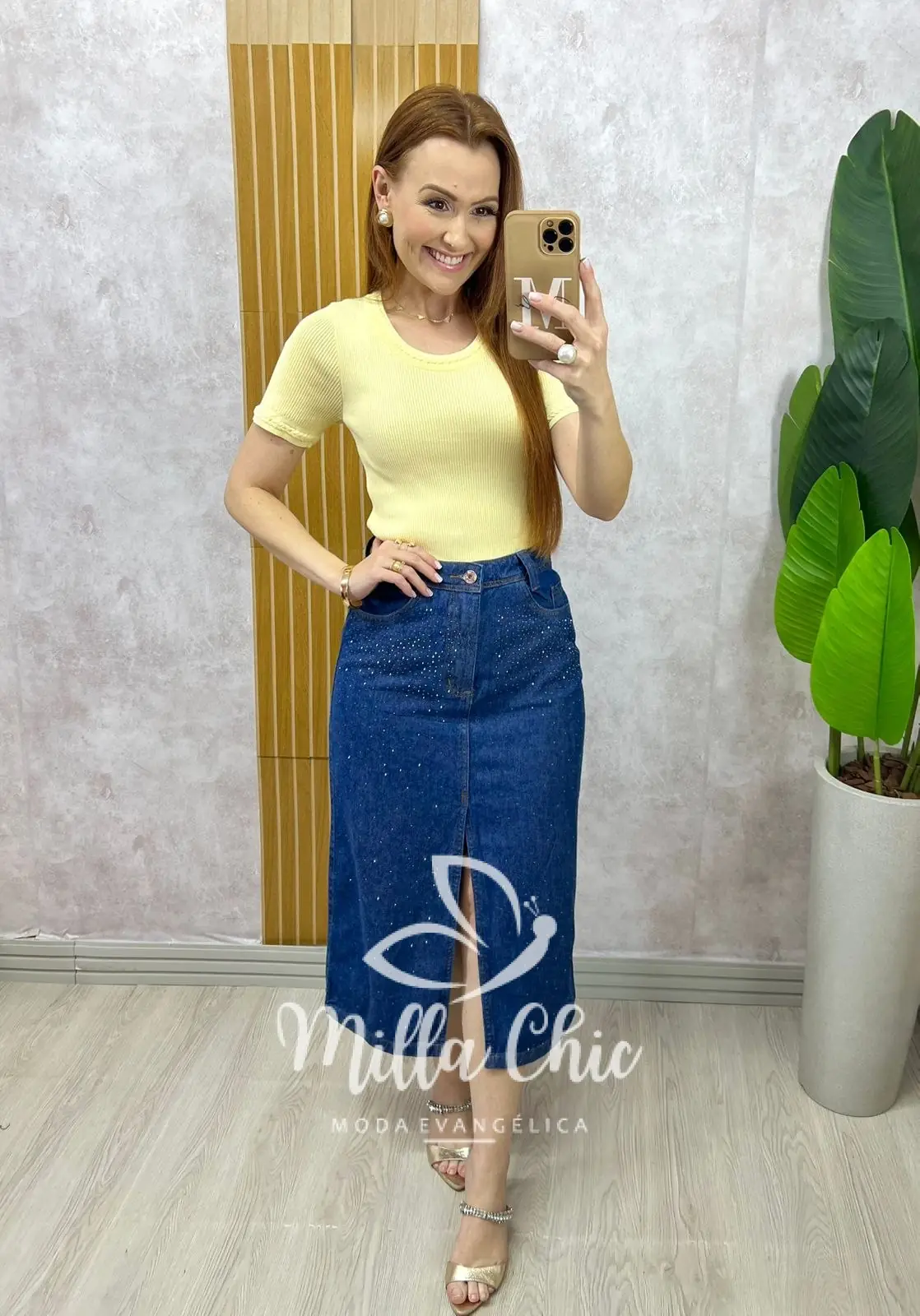 A saia jeans Karina é um modelo chic e moderno. Possui a fenda frontal , modelagem midi que deixa quem usa muito elegante . E o seu diferencial fora a lavagem linda em azul bem jeans ela tem a aplicação de strass em toda sua parte frontal deixando -a mais linda e estilosa.