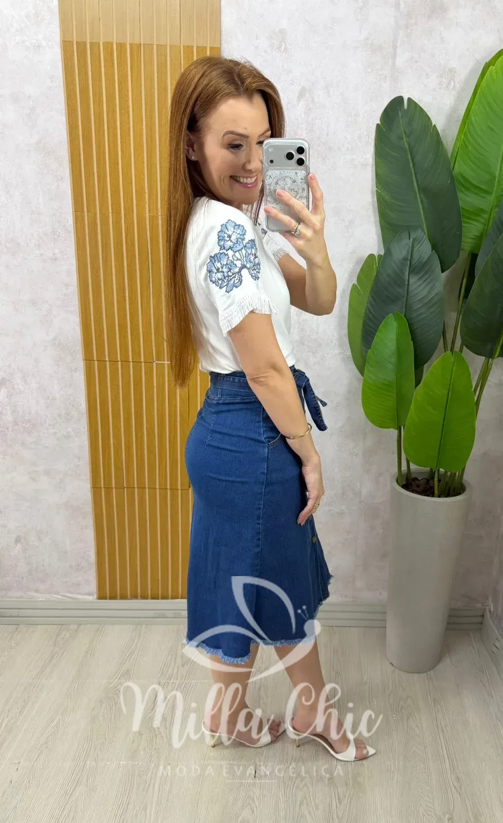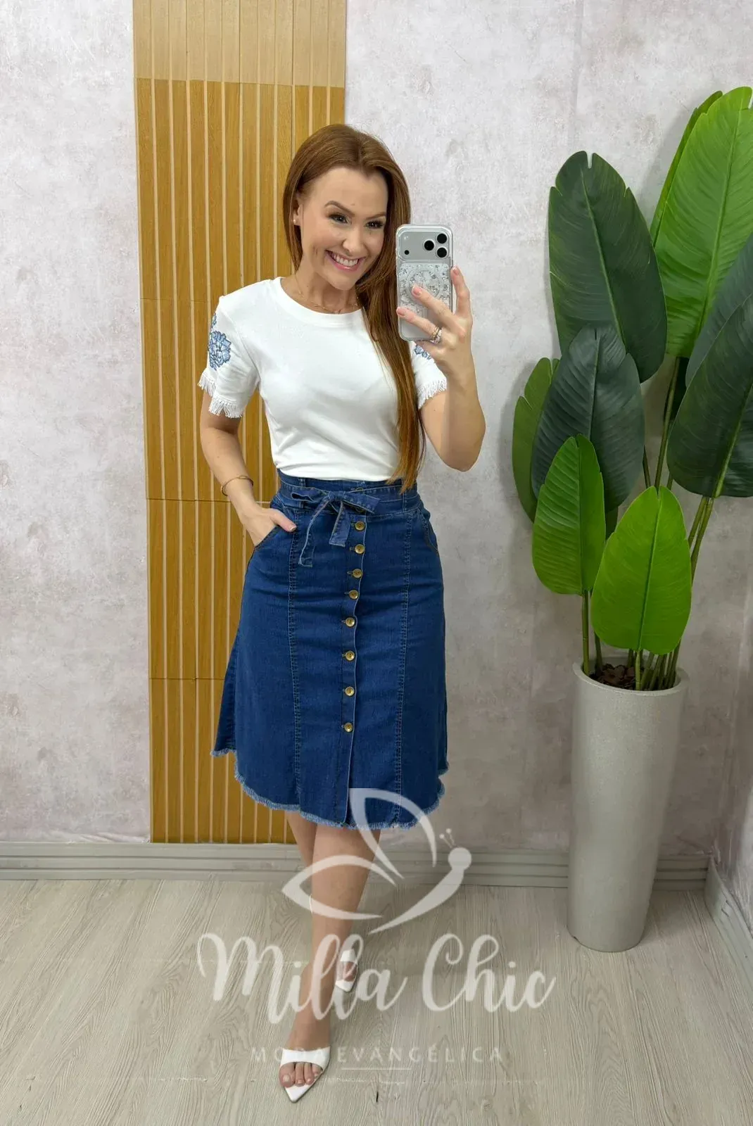 Saia jeans em algodão com elastano, confortável e com caimento impecável no corpo. Possui modelagem levemente evasê, que valoriza a silhueta com elegância.
