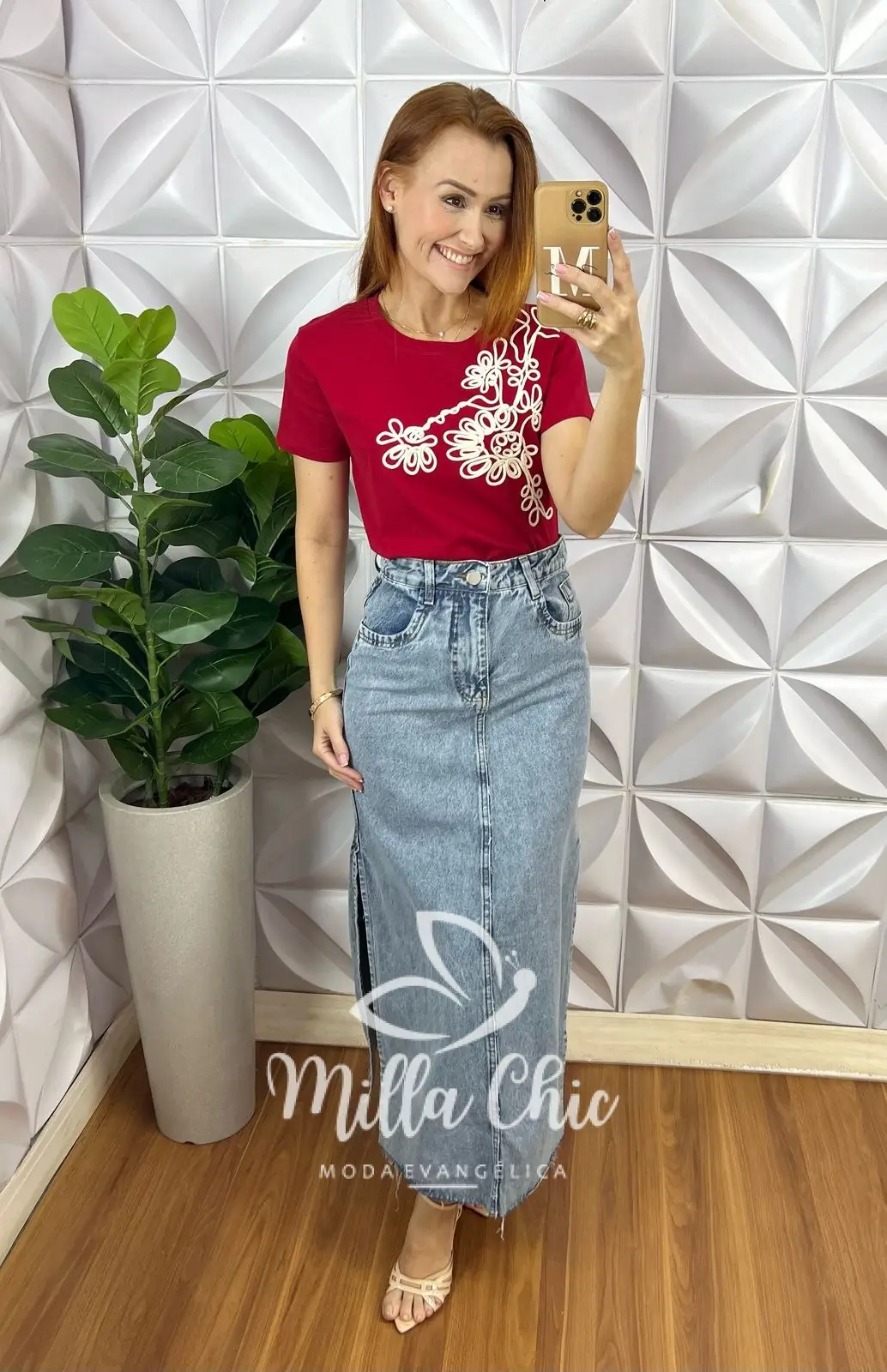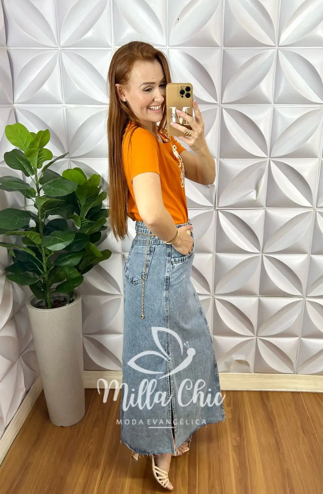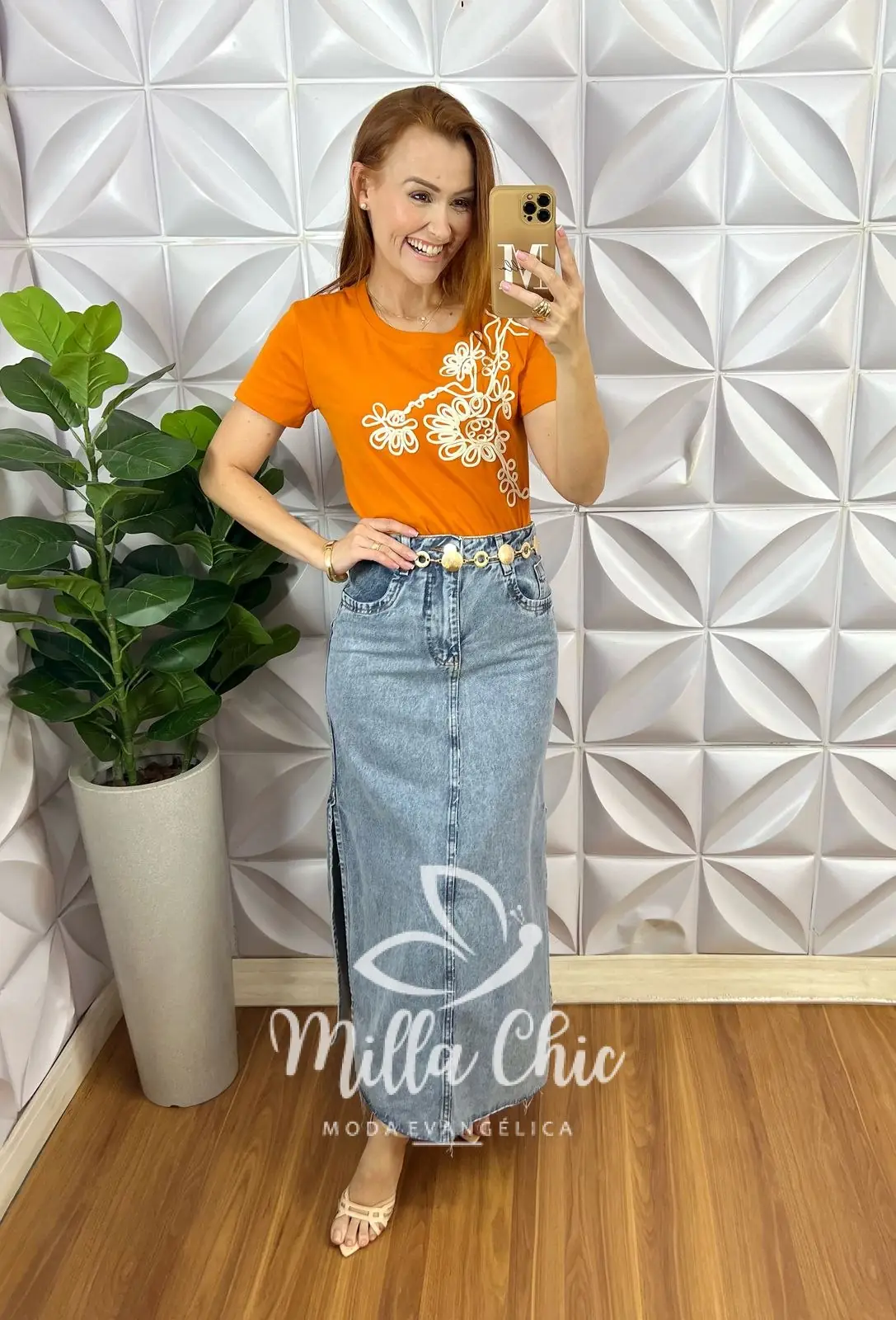 12Nossa saia jeans Nina é um modelo chic e moderno que veste super bem e deixa minhas irmãs estilosas e modernas .