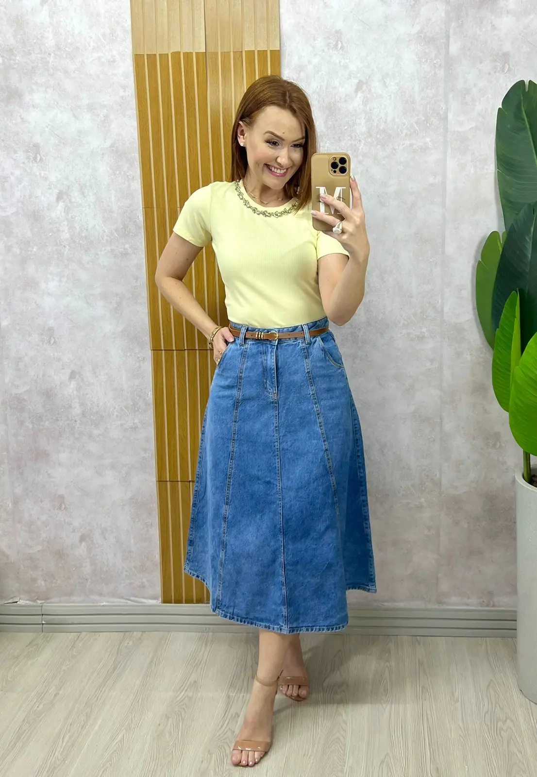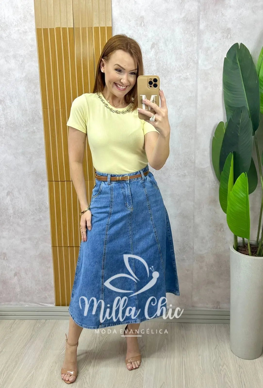 A saia Regina é perfeita para deixar seu visual ainda mais charmoso! Ideal para todos os momentos: do mais casual ao mais sofisticado. Seu corte e modelagem, vão fazer você se sentir linda e extremamente confortável! Crie composições lindíssimas com blusas, camisas ou com nosso body maravilhoso é o que estou usando na foto. Componha com saltos, para uma produção elegante ou com tênis e rastreiras para a produção mais casual. A Saia Regina tem comprimento Midi é é toda confeccionada no Jeans de Algodão {tecido bem confortável possui}: cós alto com passante e acompanha o cinto , zíper na frente, fechamento com botão , bolsinhos funcionais atrás e para finalizar a modelagem perfeita godê toda em recortes com presponto em linha caramelo que deixou ela perfeita. Você vai amar.