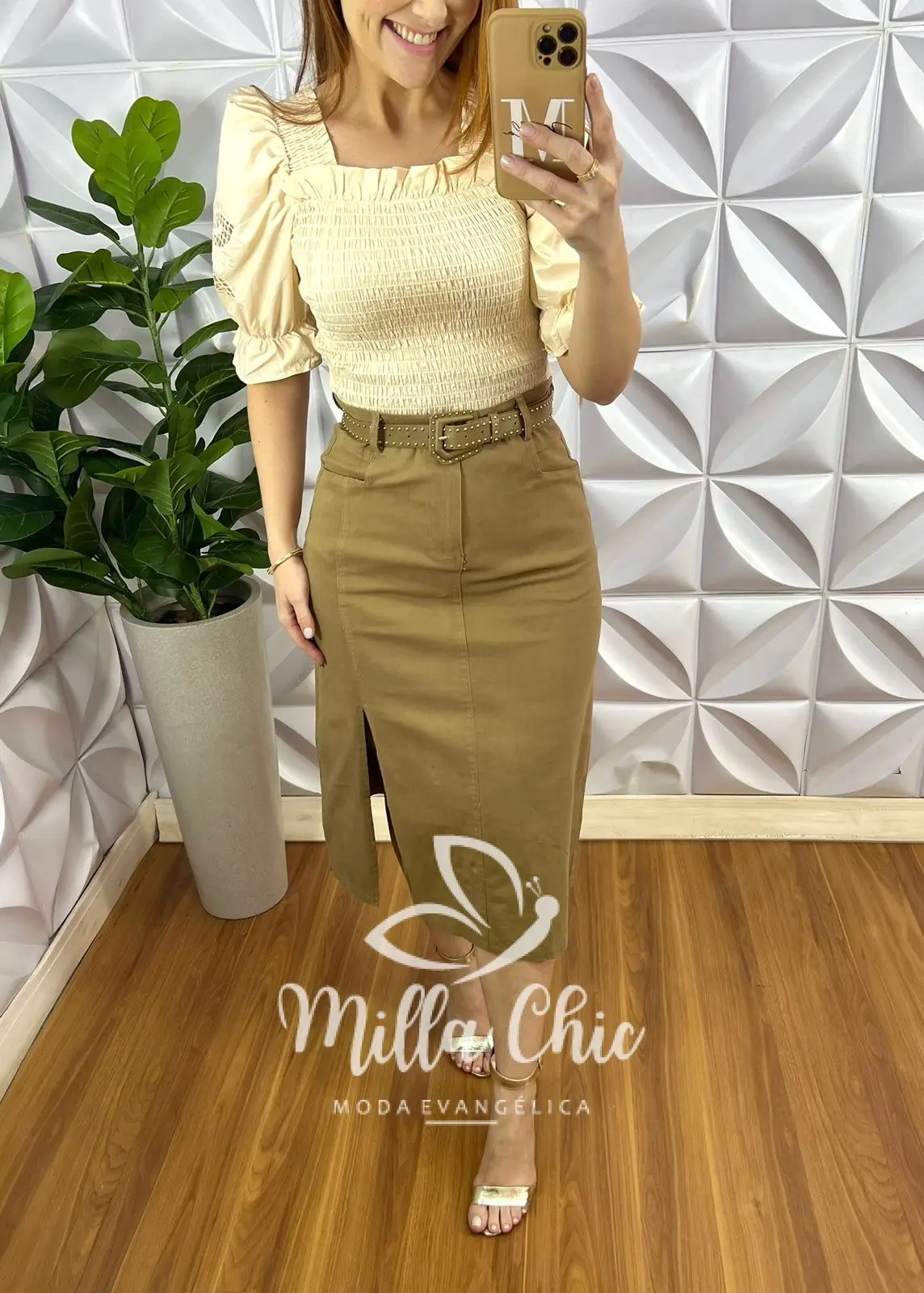 Possui: Pala na cintura, Fechamento de zíper e botão na frente, bolsos laterais, recorte na lateral com fenda, bolsos nas costas caimento reto, comprimento mídi.