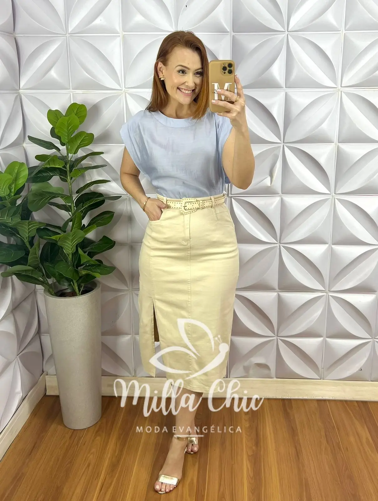 Possui: Pala na cintura, Fechamento de zíper e botão na frente, bolsos laterais, recorte na lateral com fenda, bolsos nas costas caimento reto, comprimento mídi.
