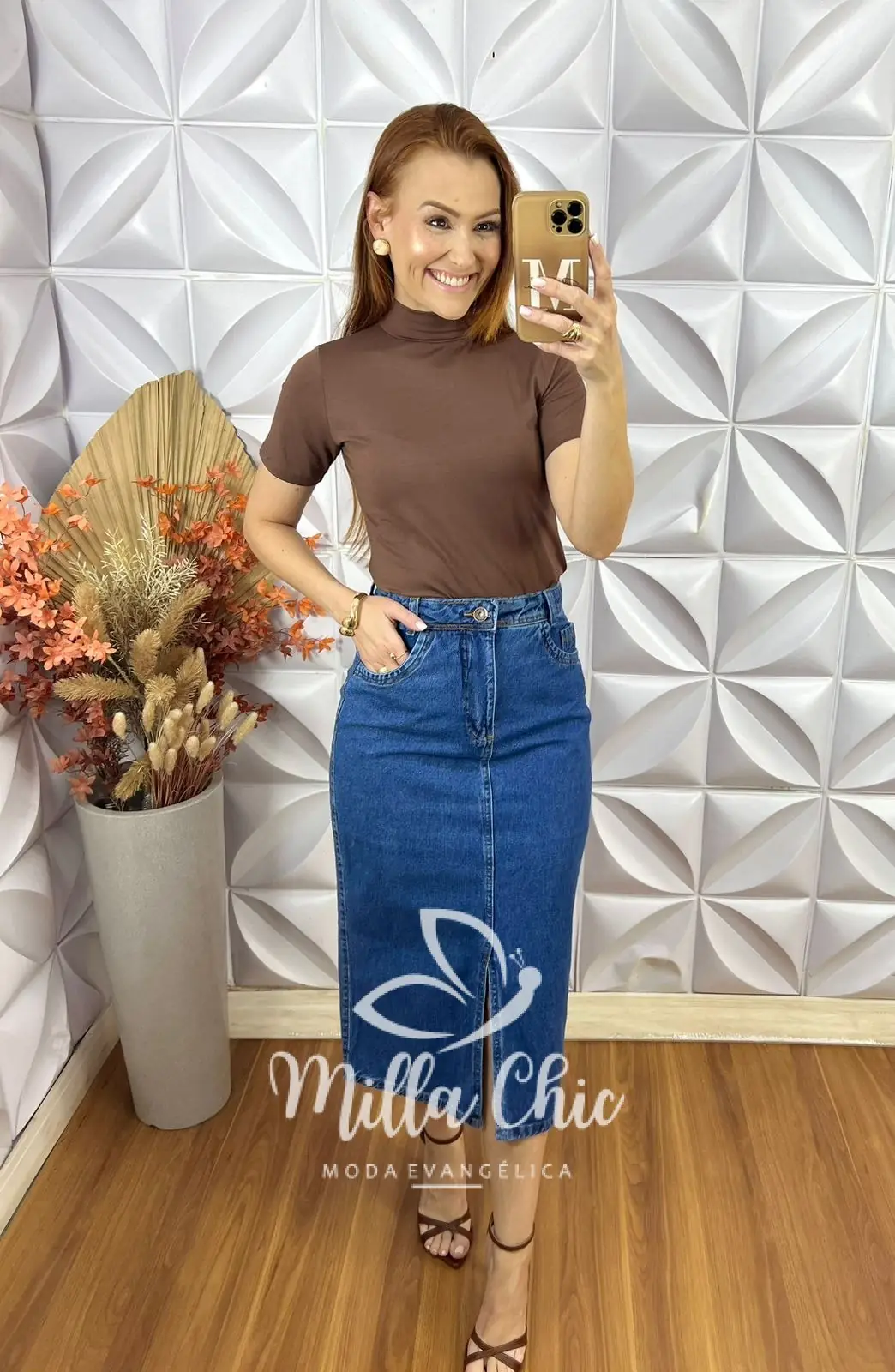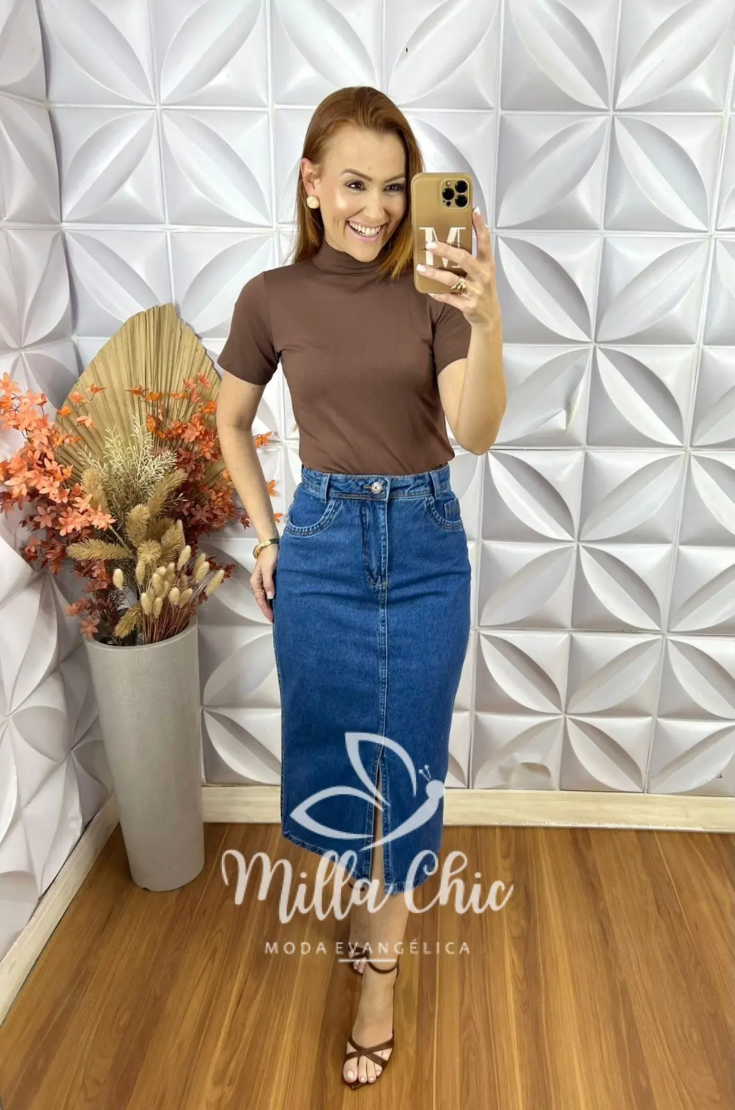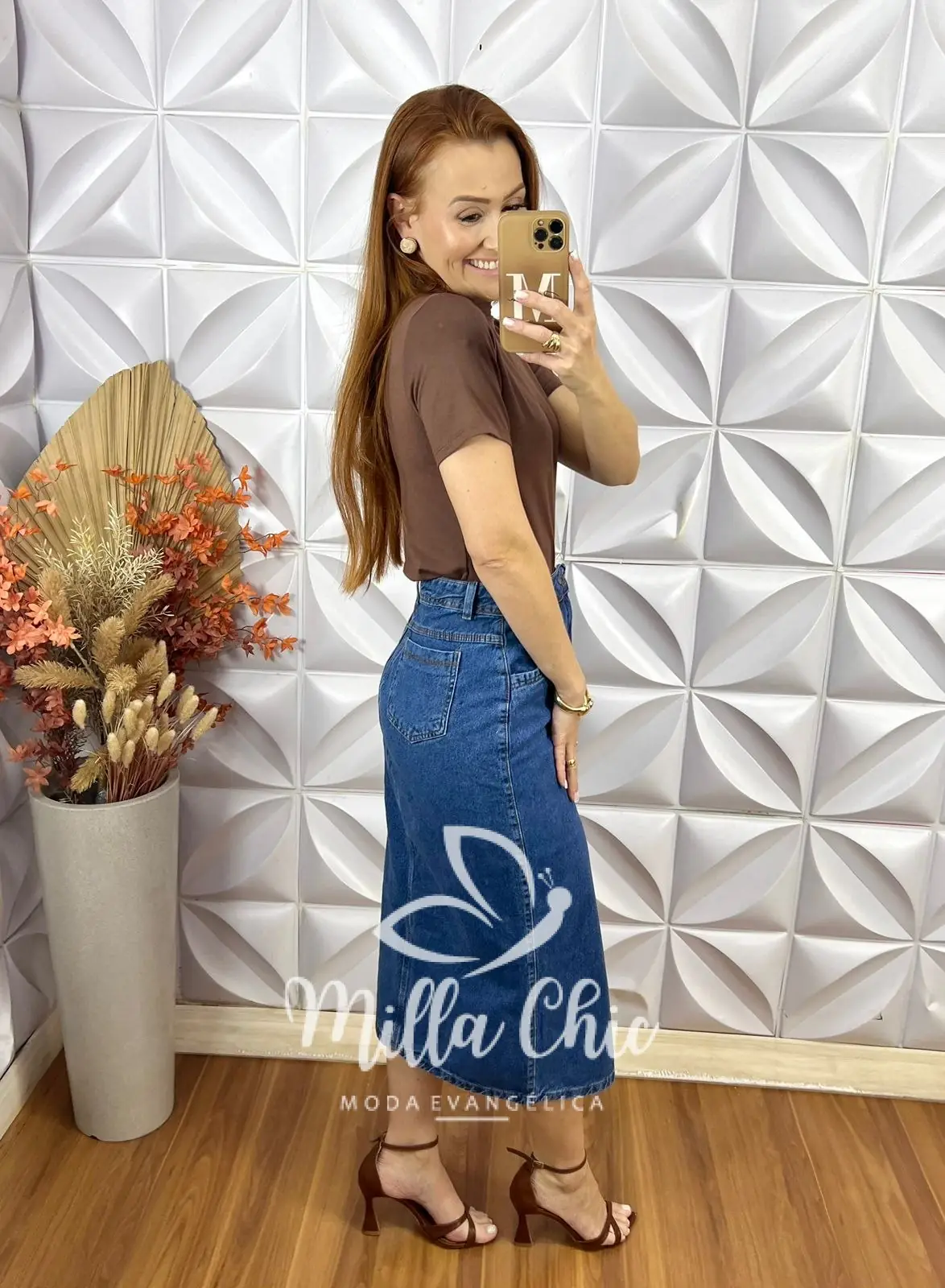 Em uma lavagem mais escura , no comprimento midi e cintura alta é aquela saia que veste muito bem e te deixa linda .