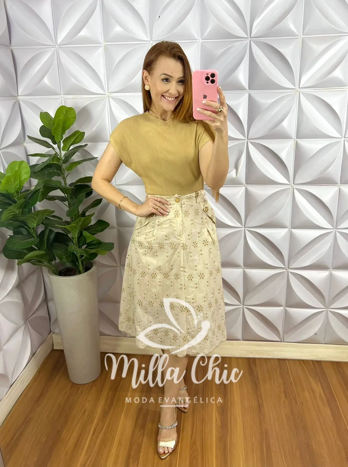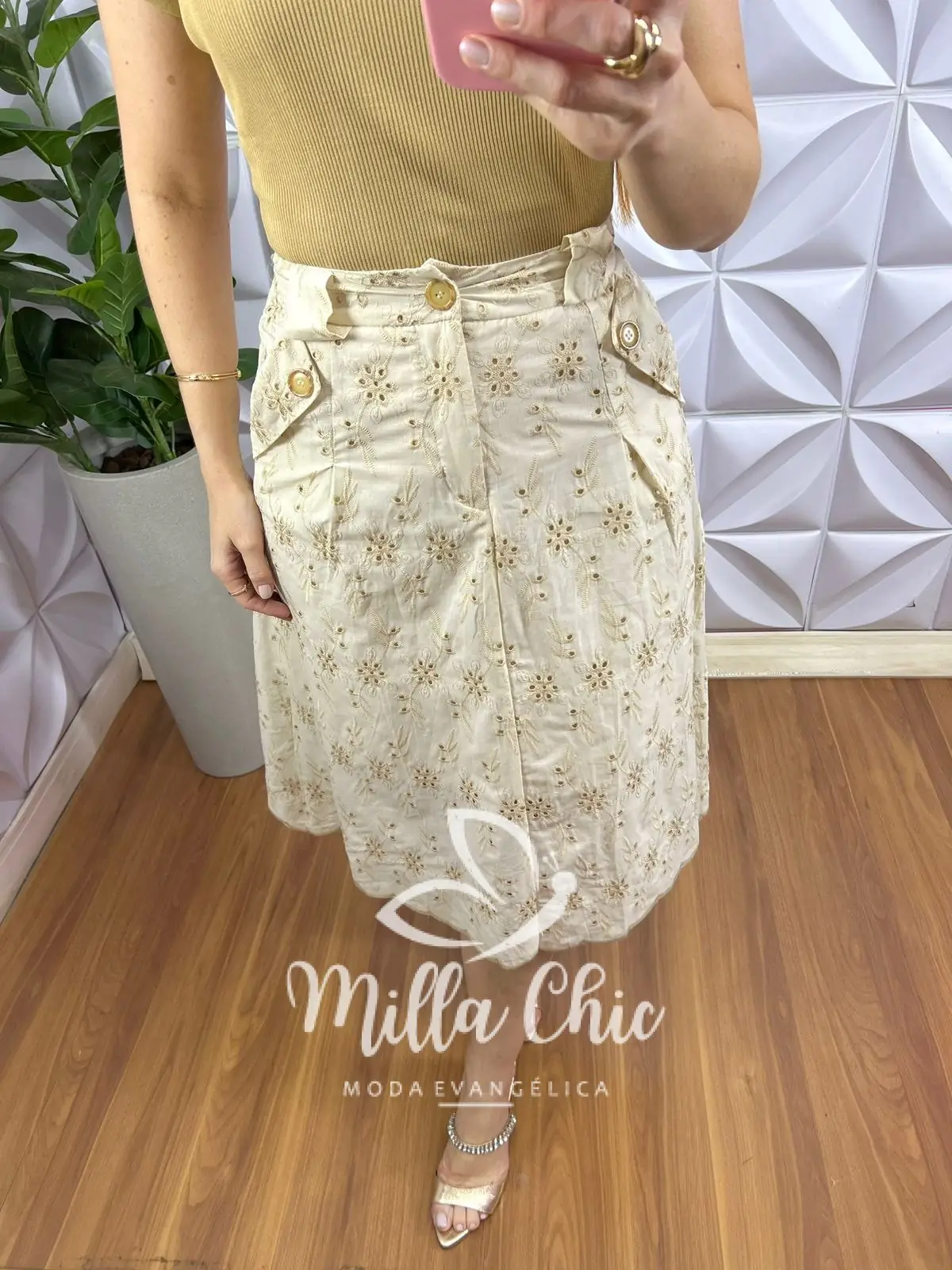 Possui: Pala na cintura, fechamento de zíper e botão, bolsos laterais, modelo mídi, Caimento evase, forrada.