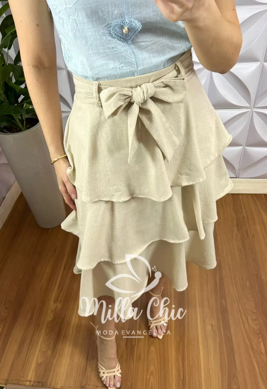 Saia Linho Com Camadas Três Marias Mídi Stela - Areia - Milla Chic