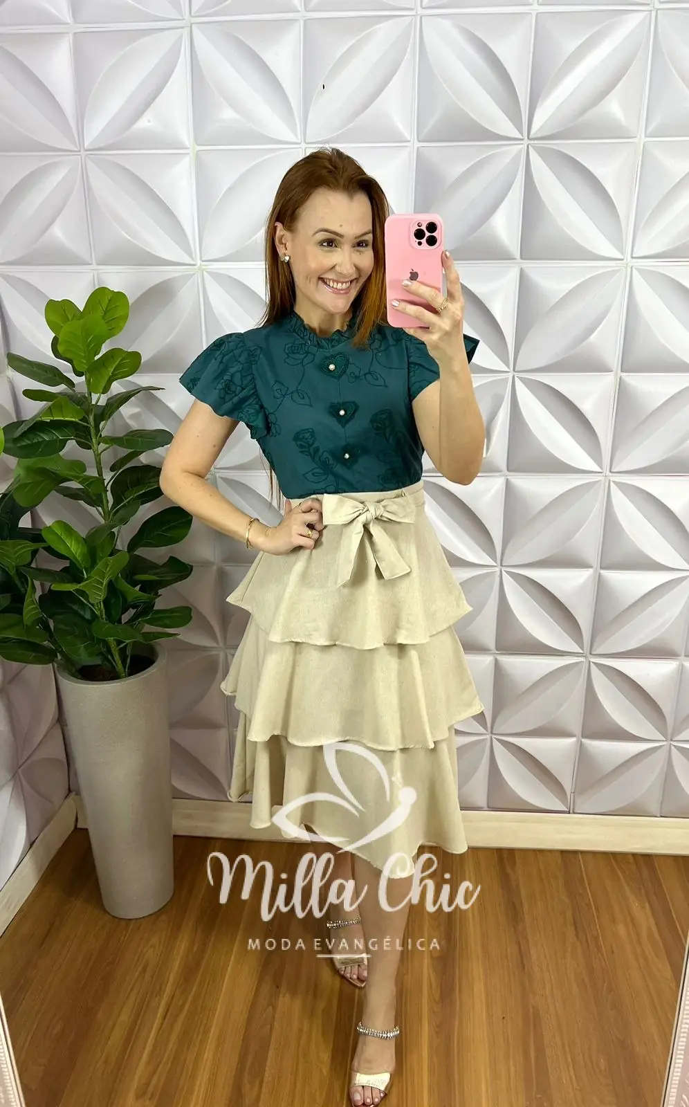 Possui: pala na cintura, forro, zíper nas costas, comprimento Mídi com camadas três marias. Acompanha cinto faixa.