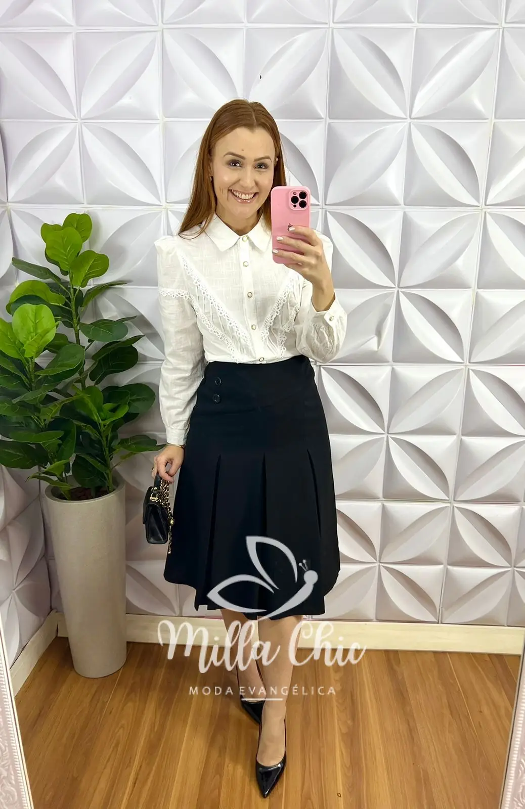 Saia Linho Com Pregas E Botão Ligia – Preto