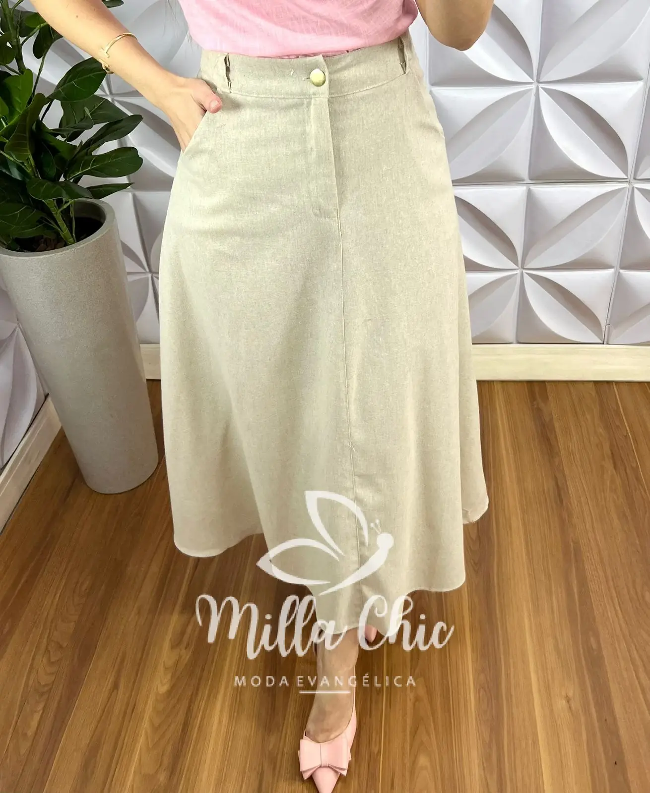 Saia Linho Godê Mídi Com Botão Dourado Luara – Areia