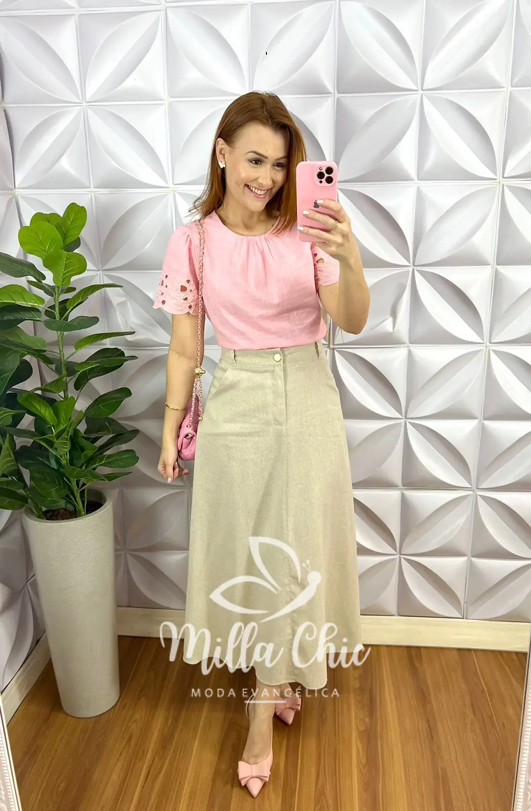 Blusa Cambraia De Linho Com Bordado Richelieu Carine - Rosa Ballet - Milla Chic