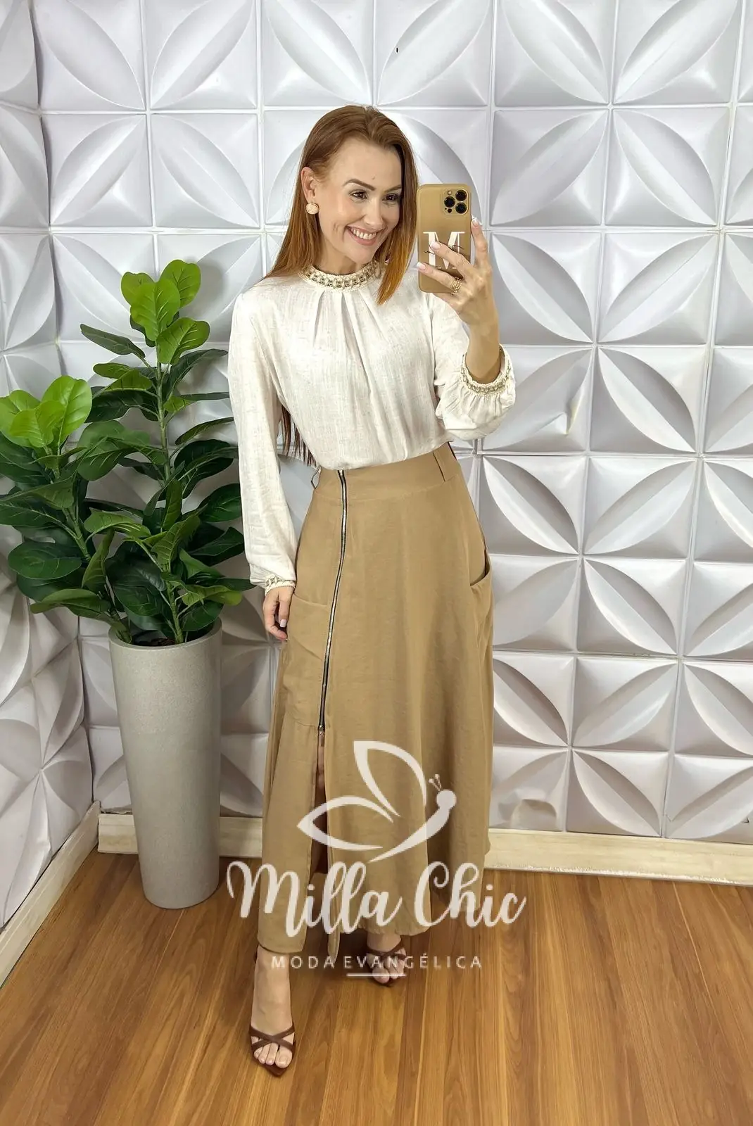 Com design moderno, ela possui cós médio, corte evasê com caimento solto e e uma fenda lateral que termina com o zíper de metal que traz sofisticação e estilo. O tecido em alfaiataria marrant alta qualidade proporciona conforto e leveza, perfeito para compor looks incríveis.