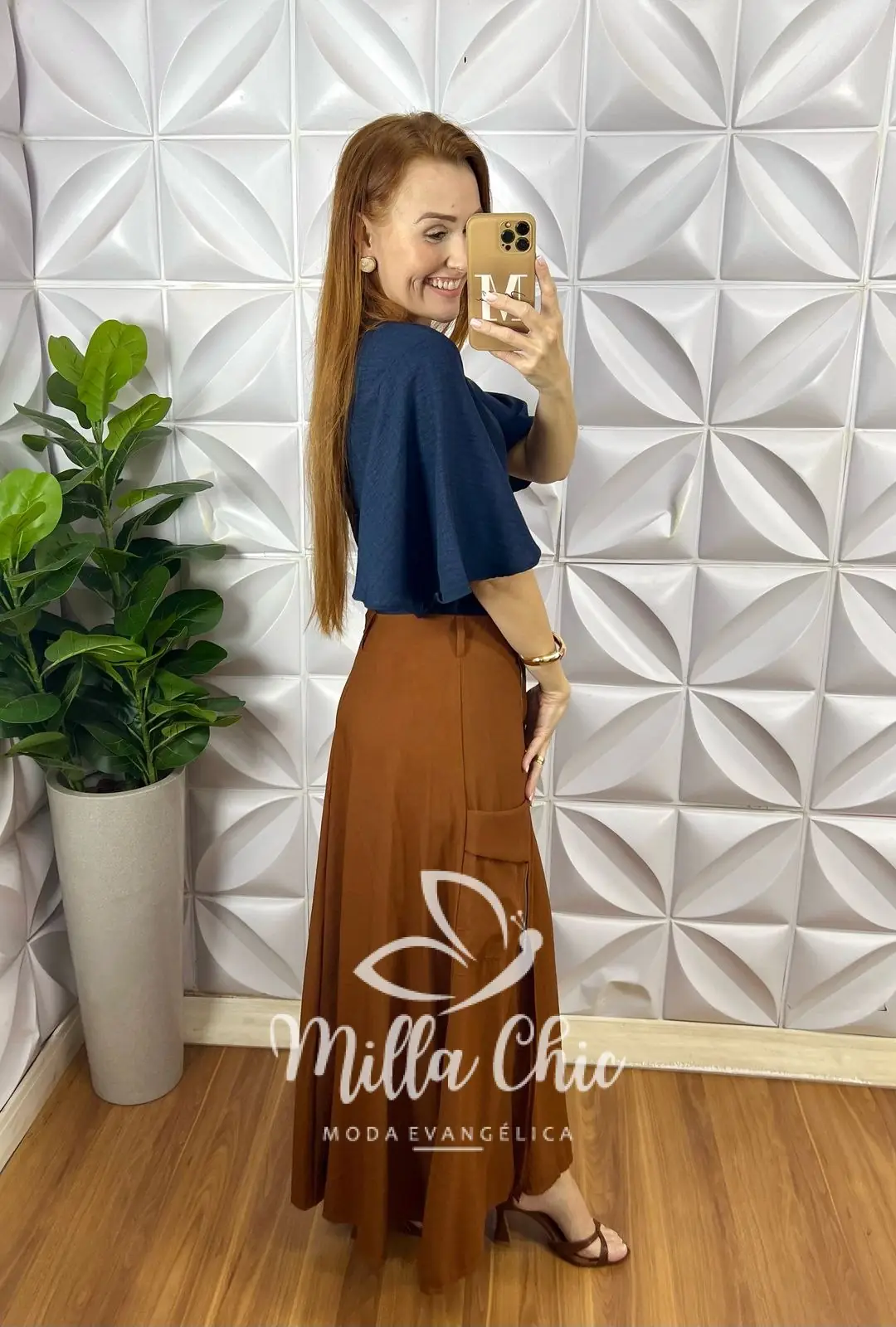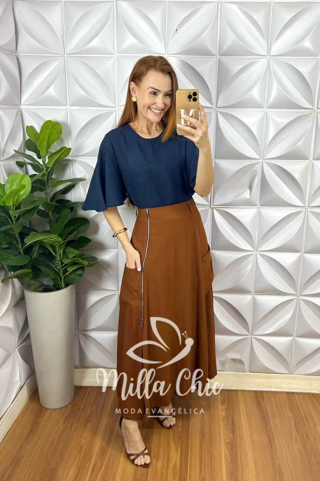 Com design moderno, ela possui cós médio, corte evasê com caimento solto e e uma fenda lateral que termina com o zíper de metal que traz sofisticação e estilo. O tecido em alfaiataria marrant alta qualidade proporciona conforto e leveza, perfeito para compor looks incríveis.
