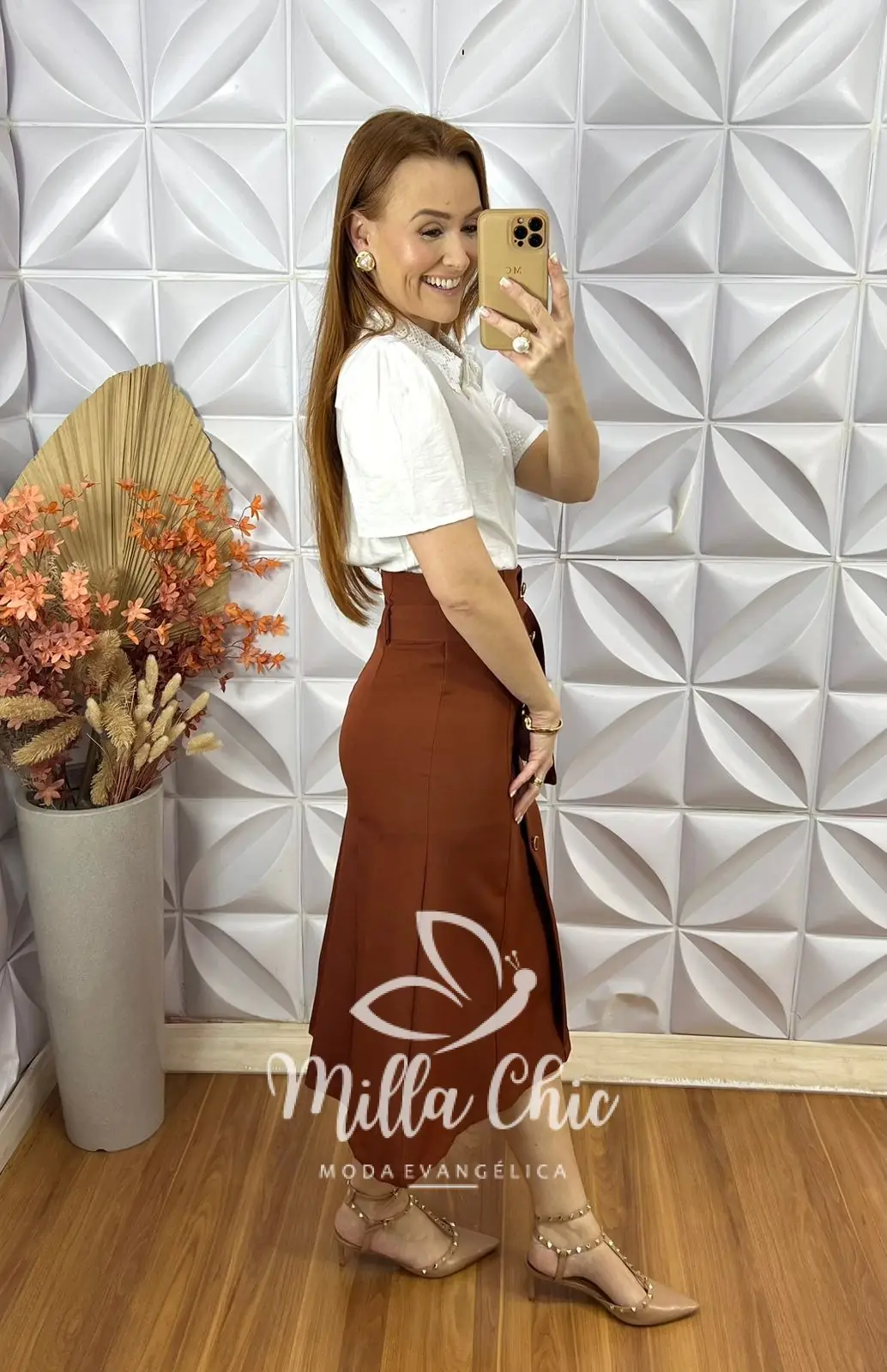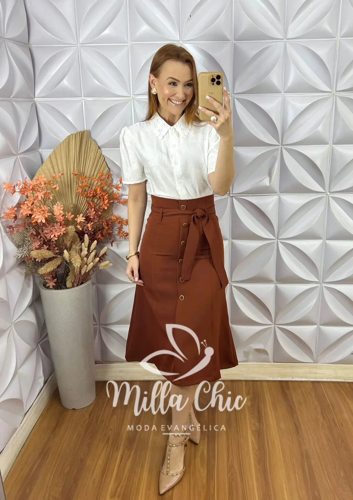 Com a cintura alta e bem marcada deixando minhas irmãs lindas e elegantes . Ela acompanha o cinto na mesma cor da saia que valoriza e da muita elegância para essa peça .