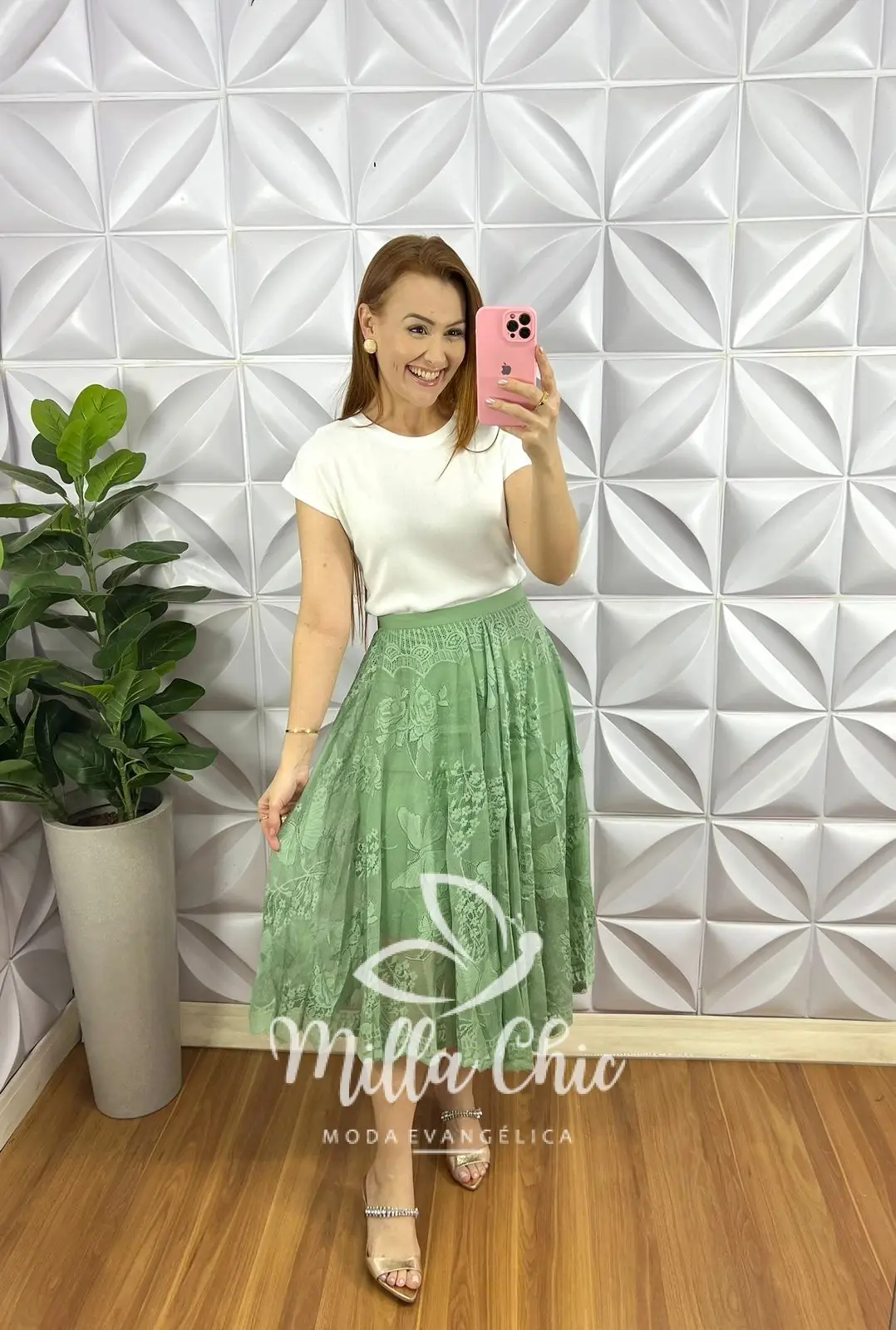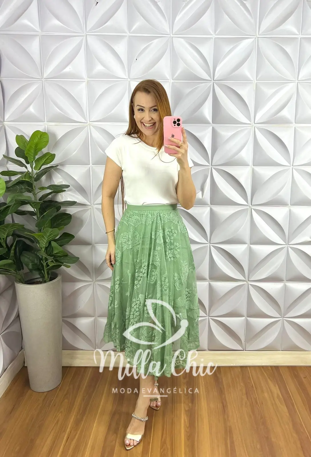 Saia Na Renda Mídi Toda Forrada Caimento Godê Layla – Verde