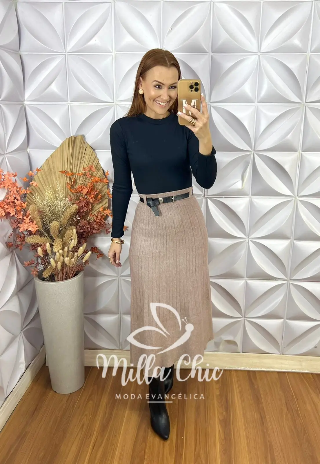 Delicada e clássica aquela saia em modelagem mais justa midi e acompanha o cinto para dar aquele charme .