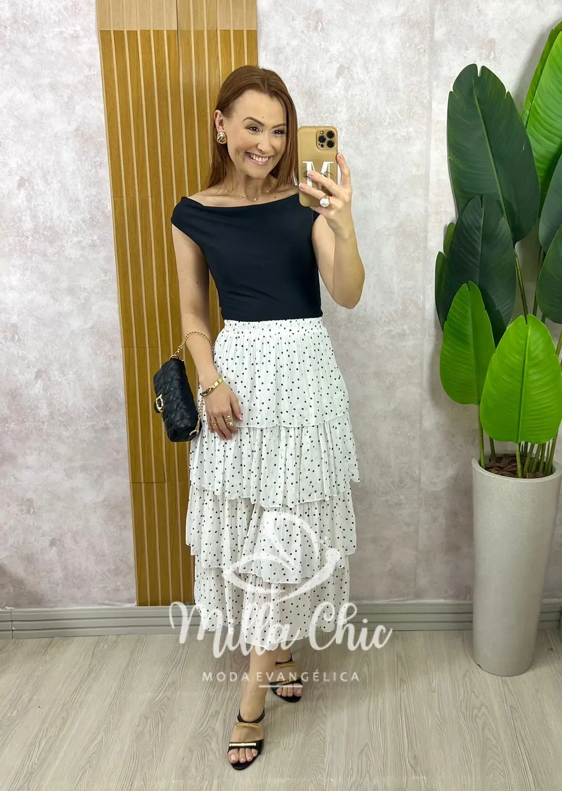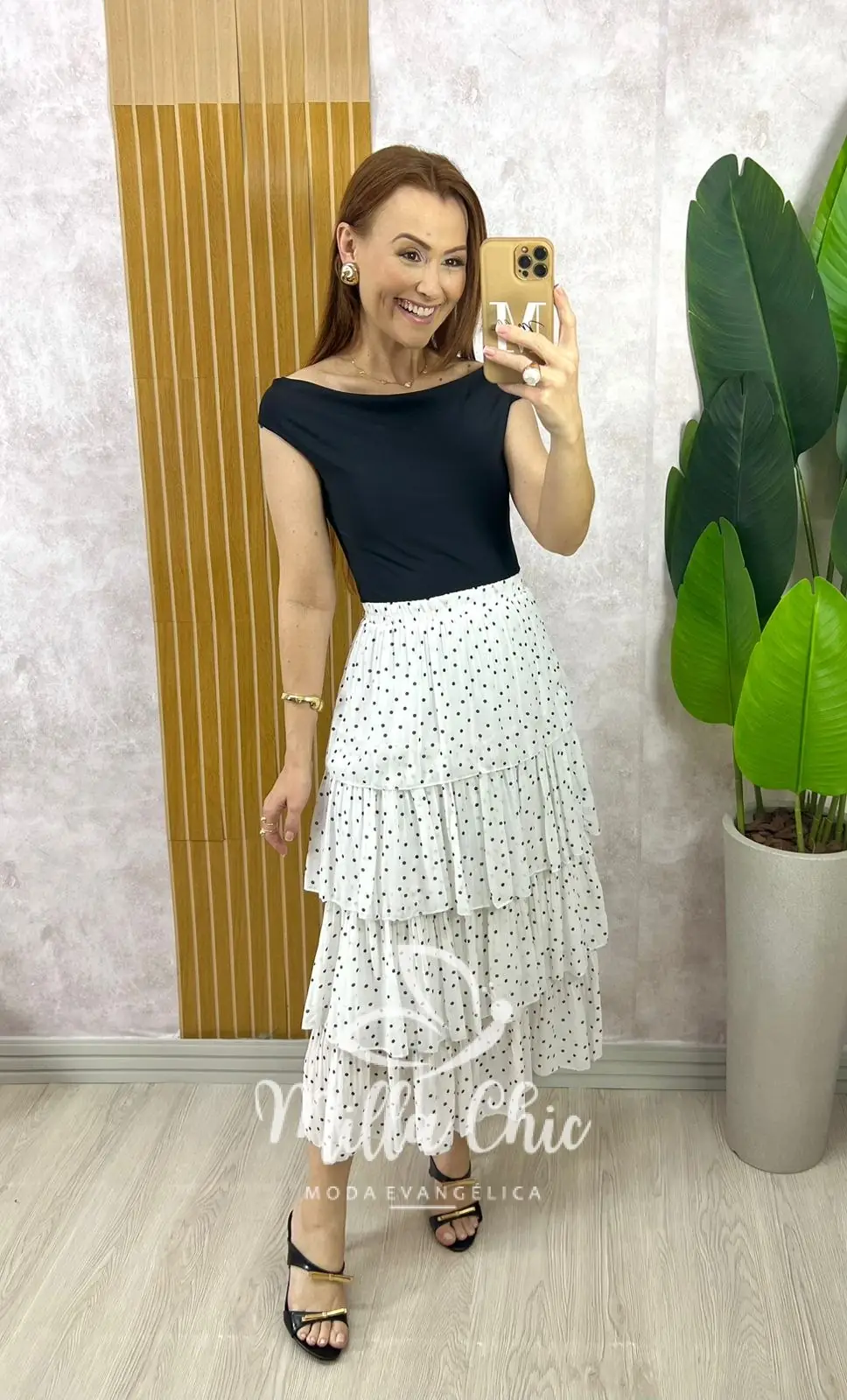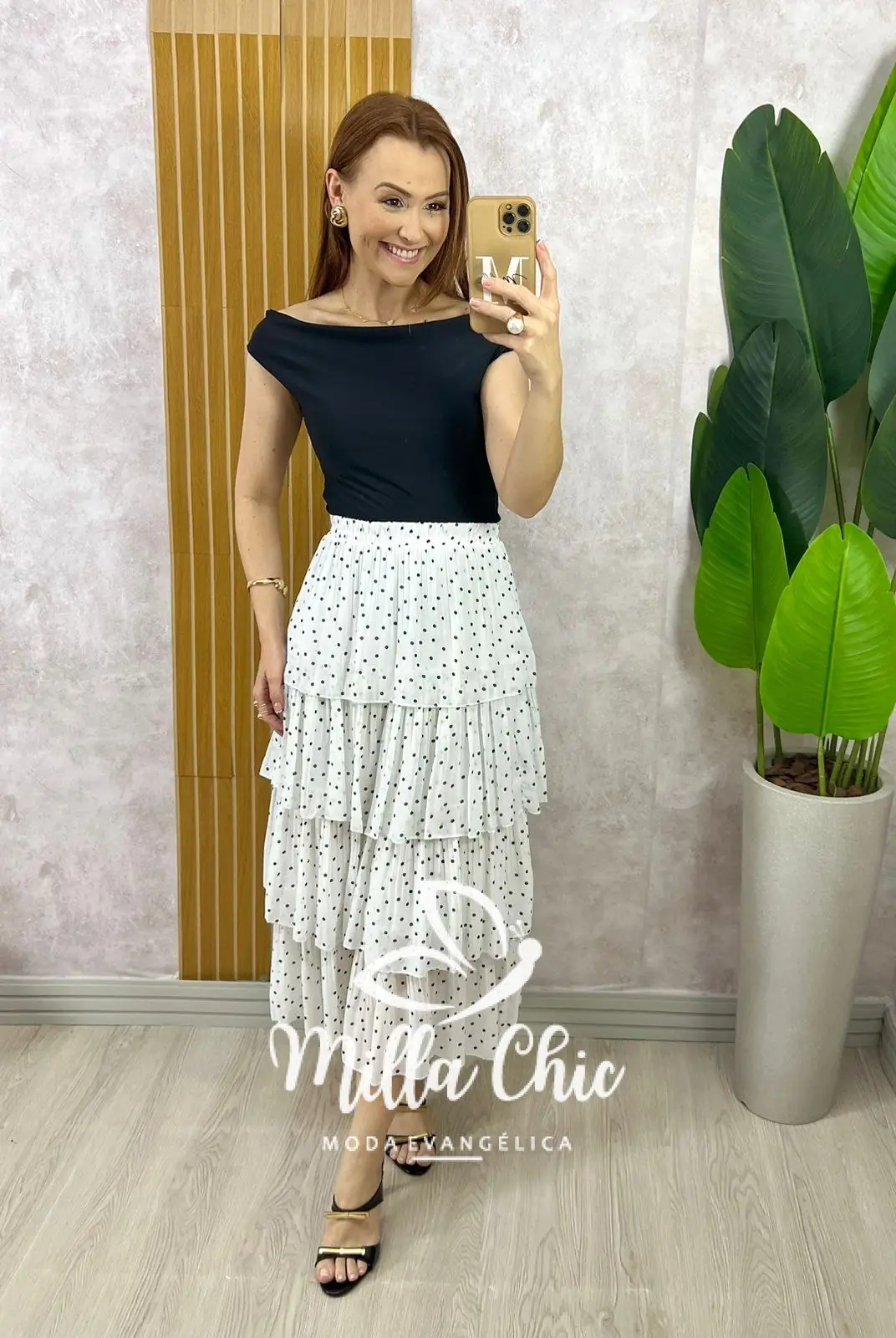 Uma saia clássica e atemporal em uma modelagem super atualizada toda em camadas sobrepostas. Diferenciada ela fica bem acinturada e desce com as marias com bastante tecido dando fluidez e volume na medida certa . Forrada .
