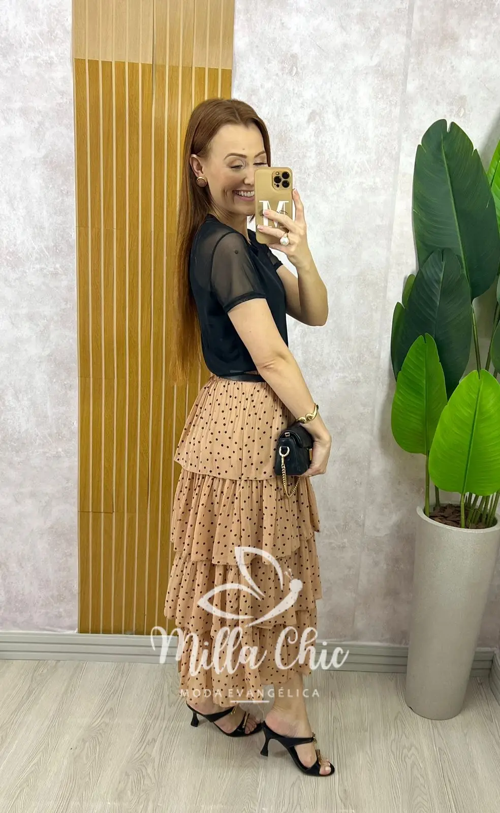 Uma saia clássica e atemporal em uma modelagem super atualizada toda em camadas sobrepostas. Diferenciada ela fica bem acinturada e desce com as marias com bastante tecido dando fluidez e volume na medida certa . Forrada .