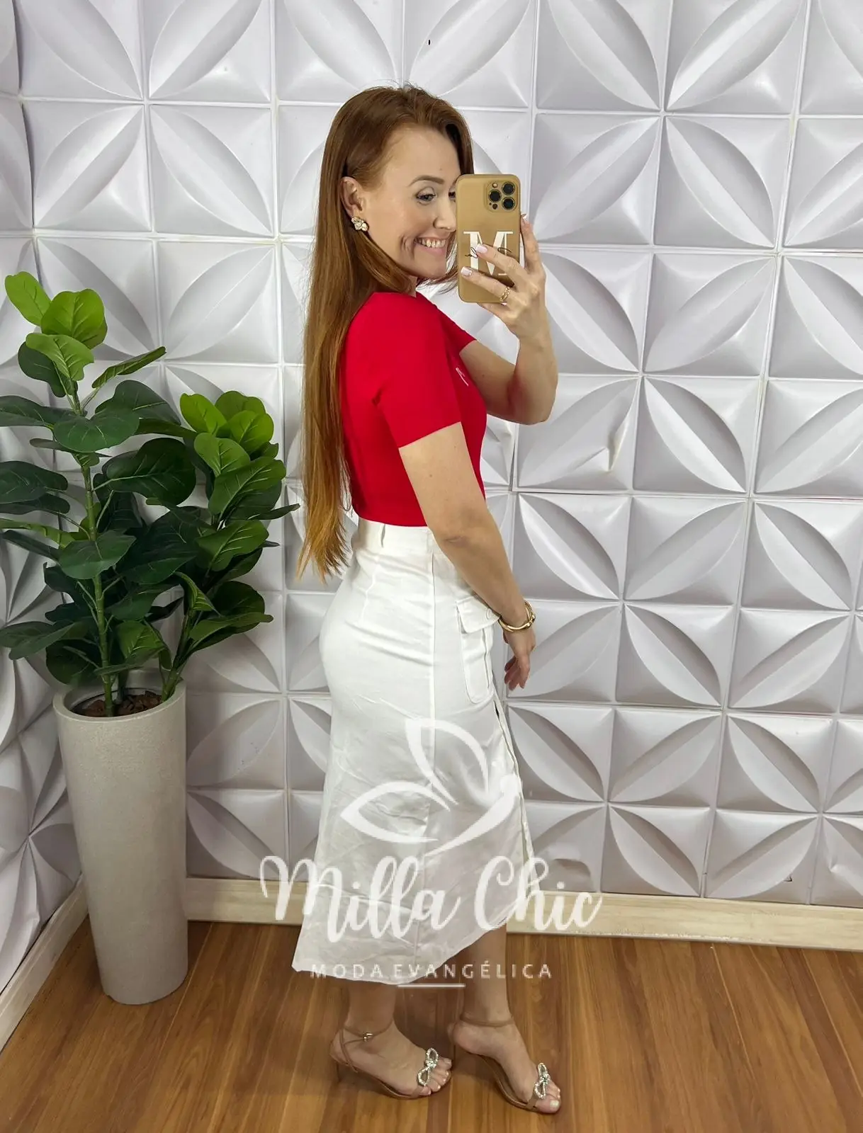 Possui: Pala na cintura, Fechamento de botões no centro da saia funcionais, bolsos laterais frontal, caimento reto, comprimento abaixo do joelho.