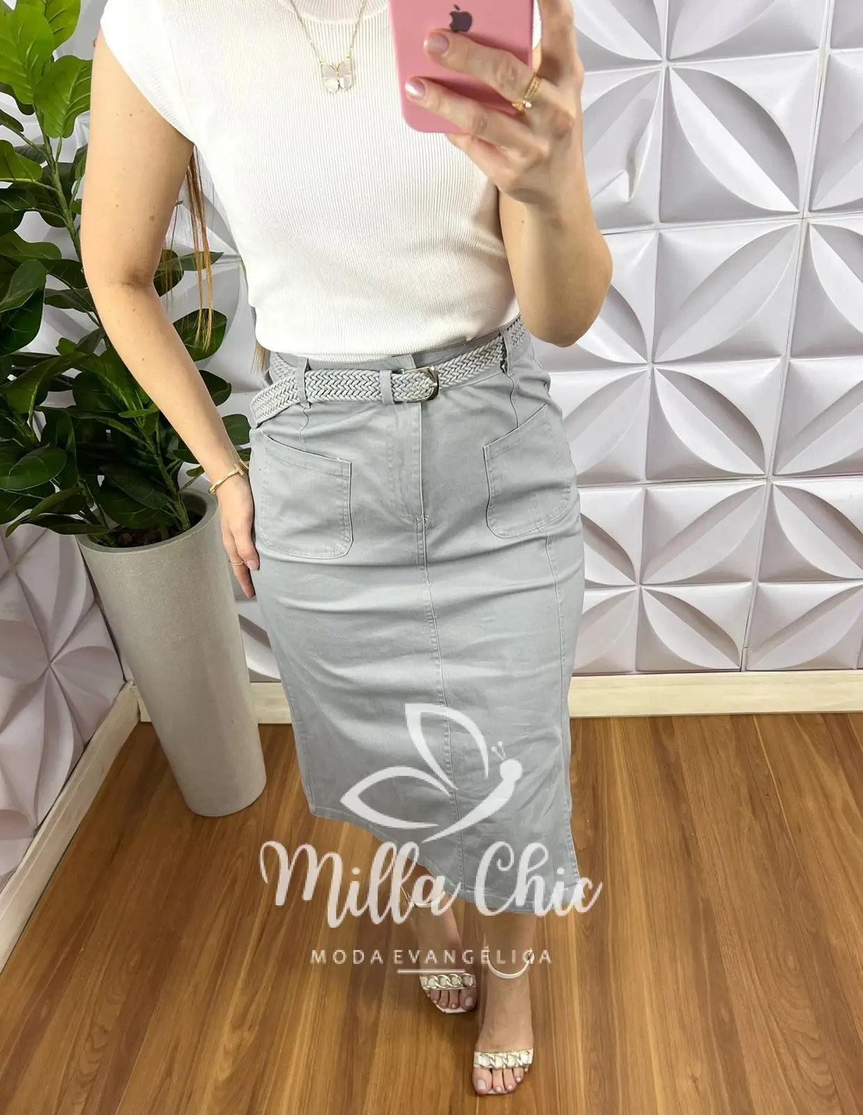 Saia Sarja Com Elastano Com Fenda E Bolsos Laterais Com Cinto Tamires - Cinza - Milla Chic