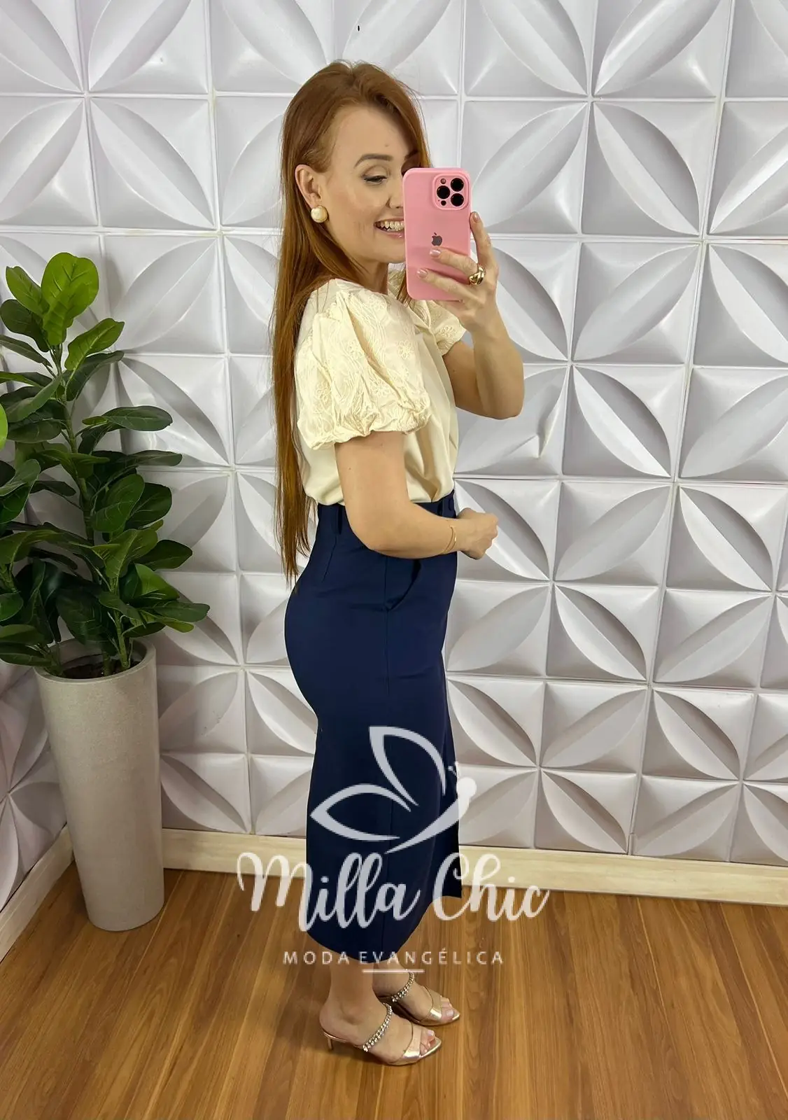 Tecido: Sarja – Composição: 75% Viscose| 20% Poliamida| 5% Elastano.