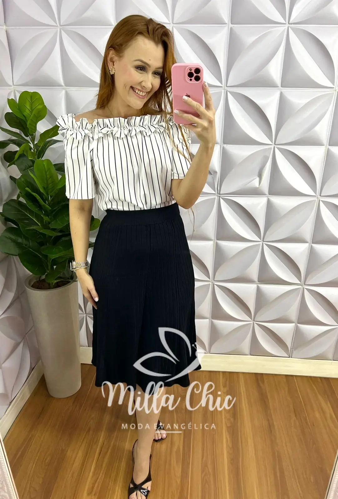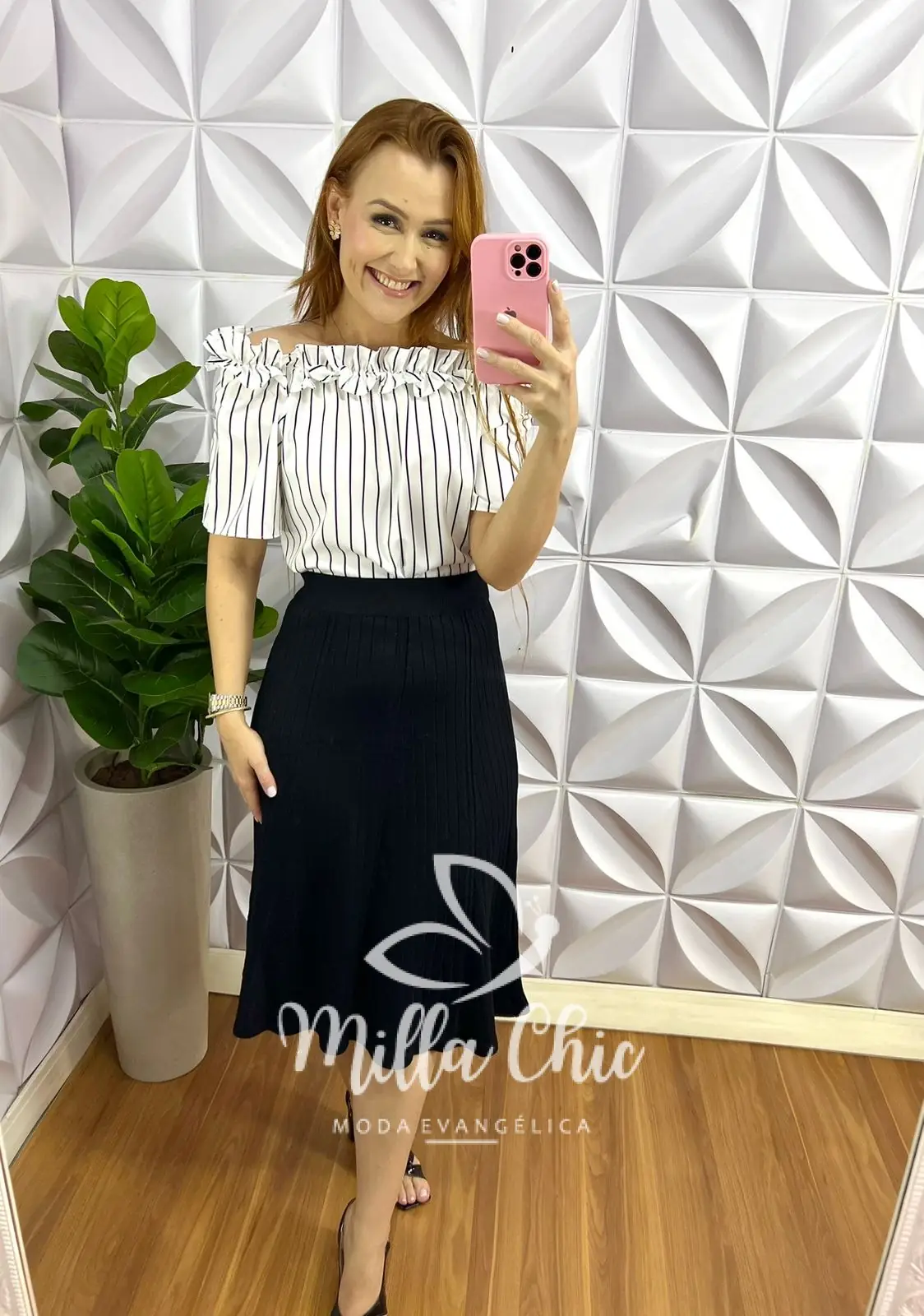 Saia Trico Com Elástico Na Cintura Midi Isabel - Preta - Milla Chic