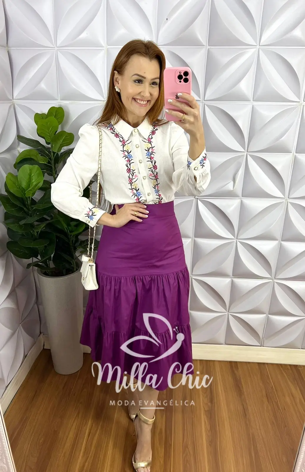 Saia Tricoline De Algodão Três Marias Mídi Marisa - Roxa - Milla Chic