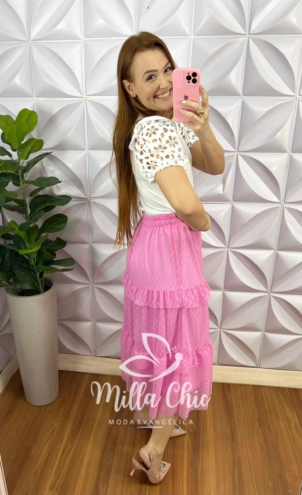 Saia Tule Bolinha Mídi com Lastex na Cintura Amora - Rosa - Milla Chic